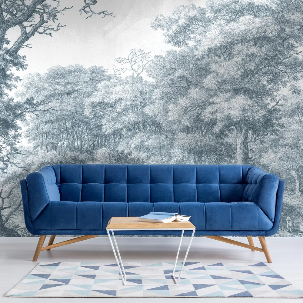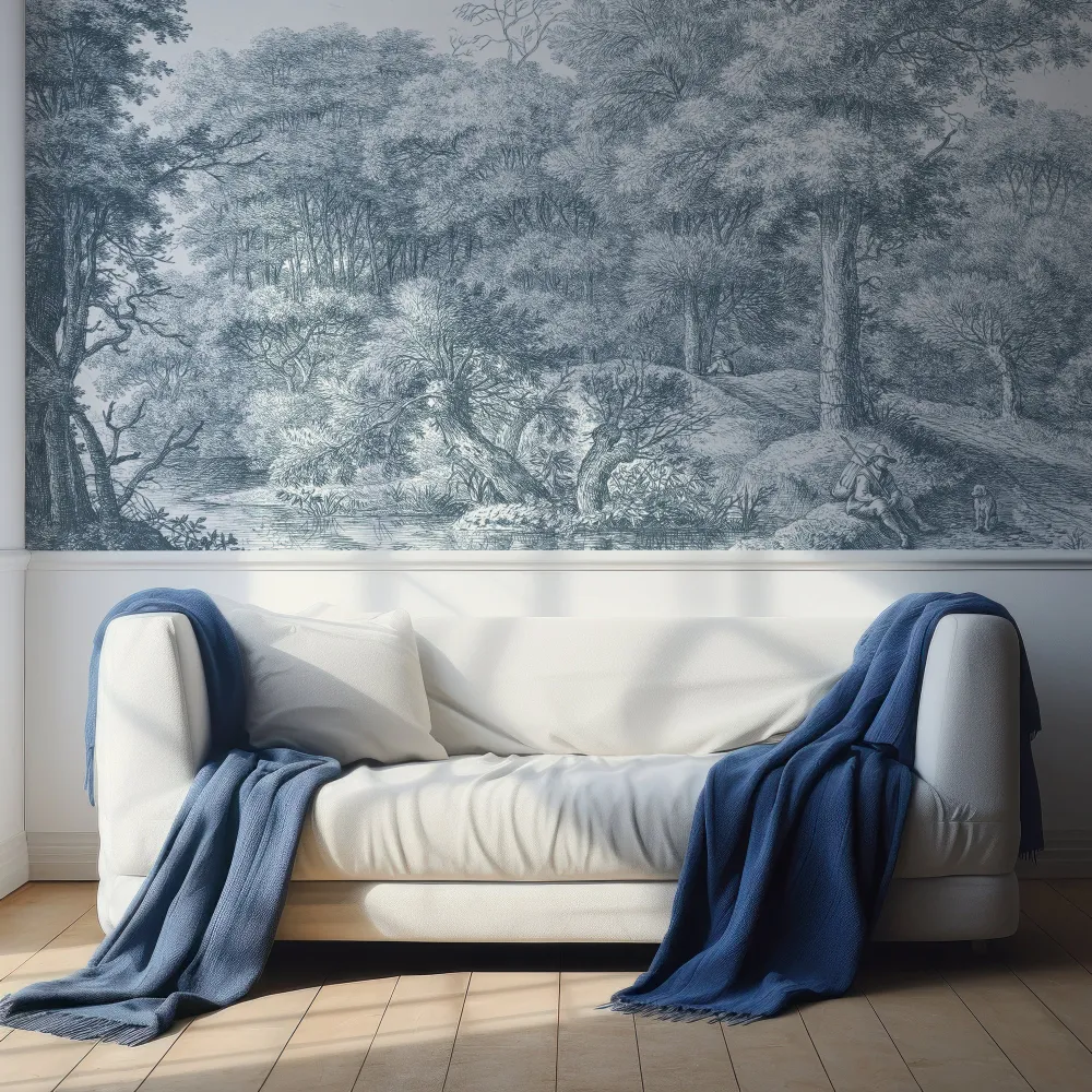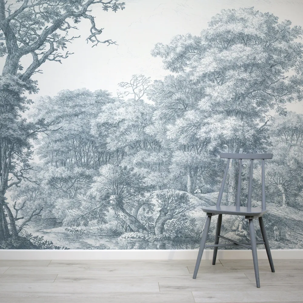 Transforme seu ambiente com o encantador Papel de Parede Paisagem Azul Campo Inglês. Este design cativante retrata uma vista serena do campo inglês em tons de azul, com árvores majestosas, um charmoso lago e a silhueta de um homem e seu fiel cão, tudo isso com um toque vintage que traz sofisticação ao espaço. Perfeito para quem valoriza a charmosa estética do campo inglês.