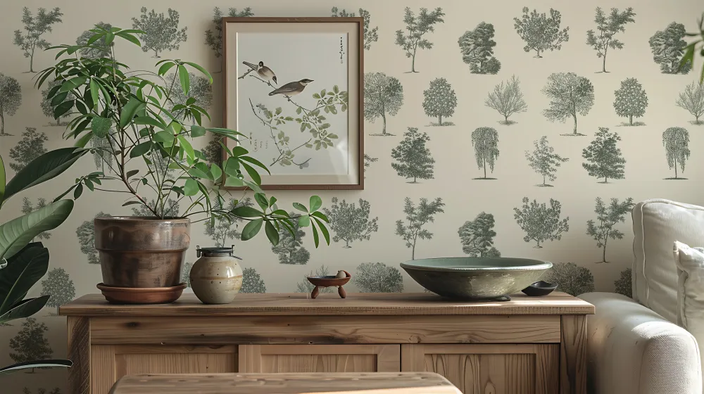 Transforme seu ambiente em um refúgio campestre com nosso papel de parede inspirador. Com um design elegante que retrata a beleza serena de árvores em um cenário natural, este papel de parede combina perfeitamente com cores neutras e texturas de madeira, trazendo um toque acolhedor para qualquer espaço.