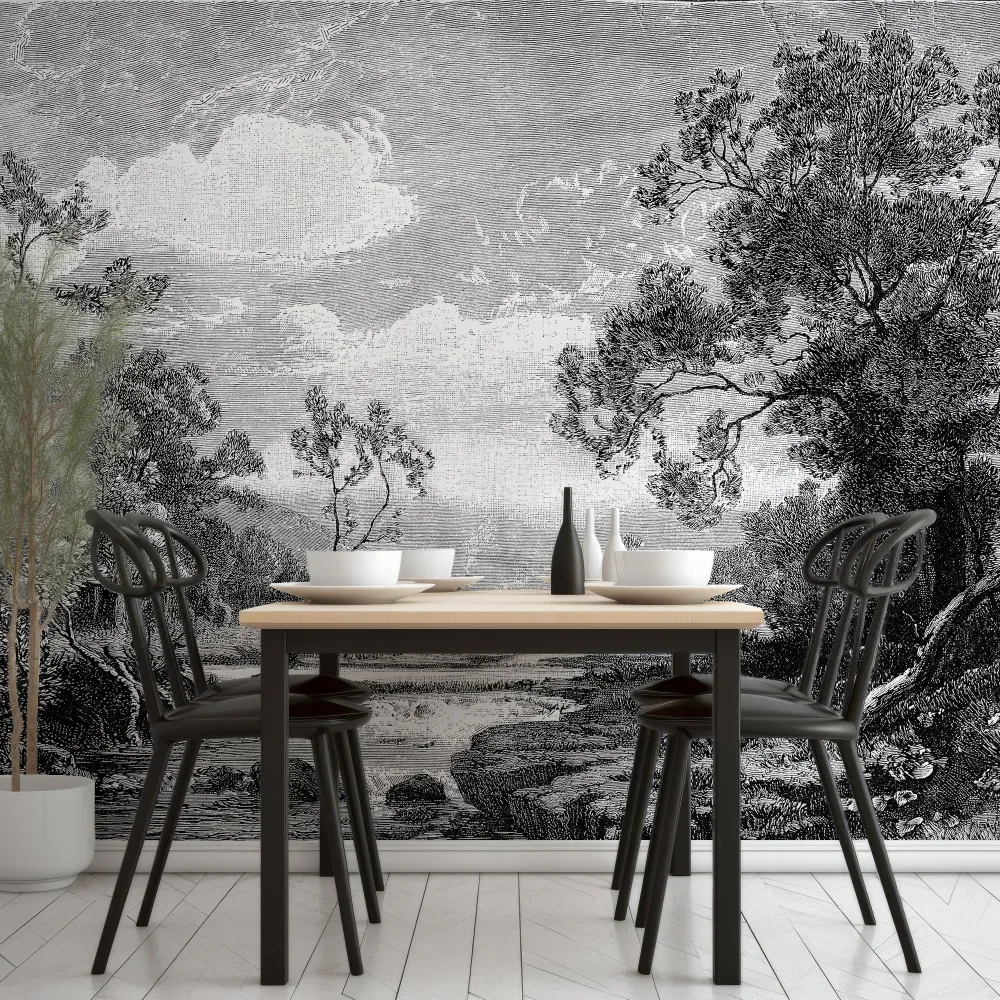 Papel de Parede Paisagem Rústica em Preto e Branco MP