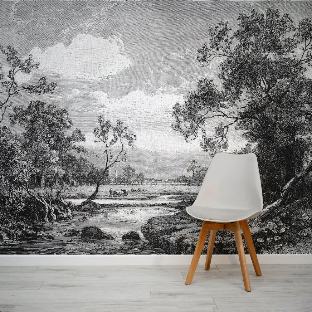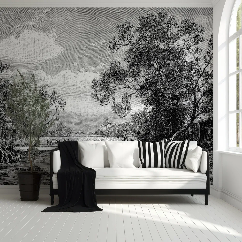 Transporte-se para uma era passada com o nosso Papel de Parede Paisagem Rústica em Preto e Branco. Esta arte apresenta uma gravura vintage de um tranquilo banco de rio, cercado por árvores e um céu nublado, evocando um charme rústico e nostálgico. Ideal para quem deseja adicionar caráter a qualquer ambiente, seja uma sala de estar aconchegante ou um estudo sereno, este mural oferece um apelo atemporal que enriquecerá a atmosfera do seu lar.