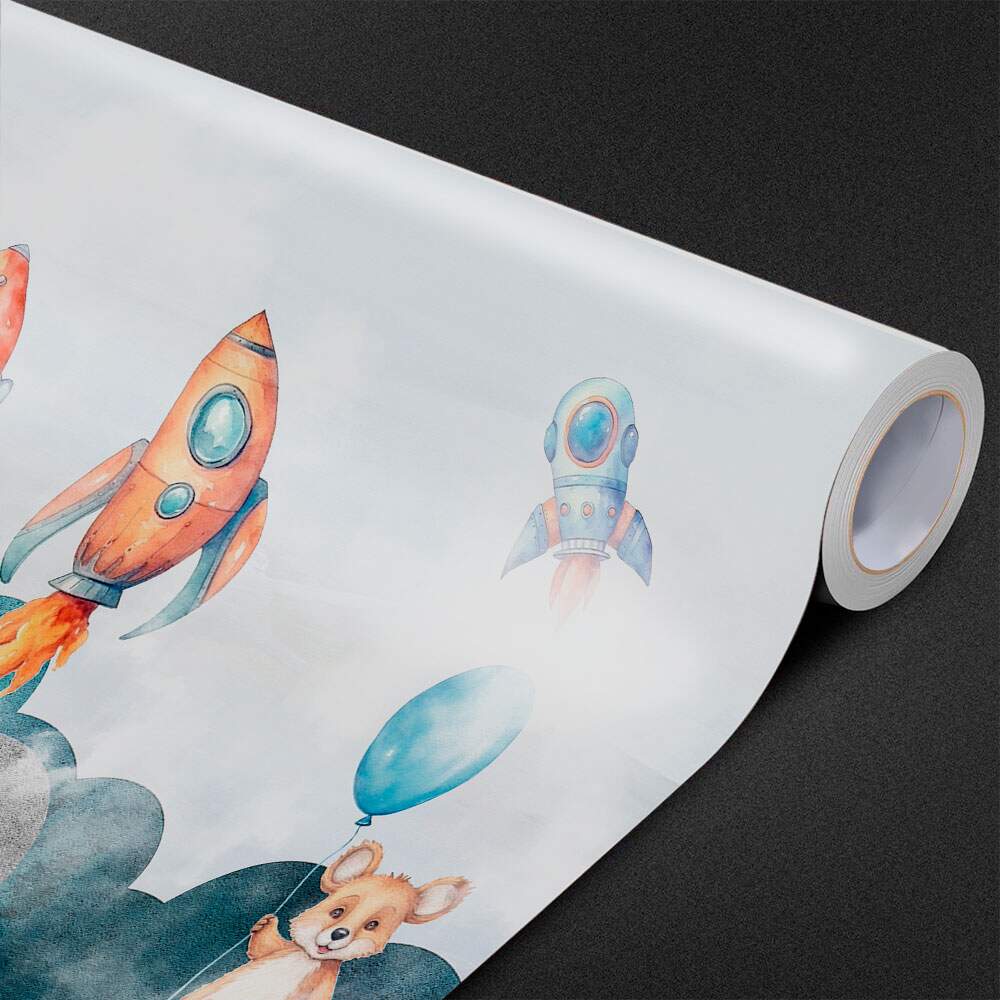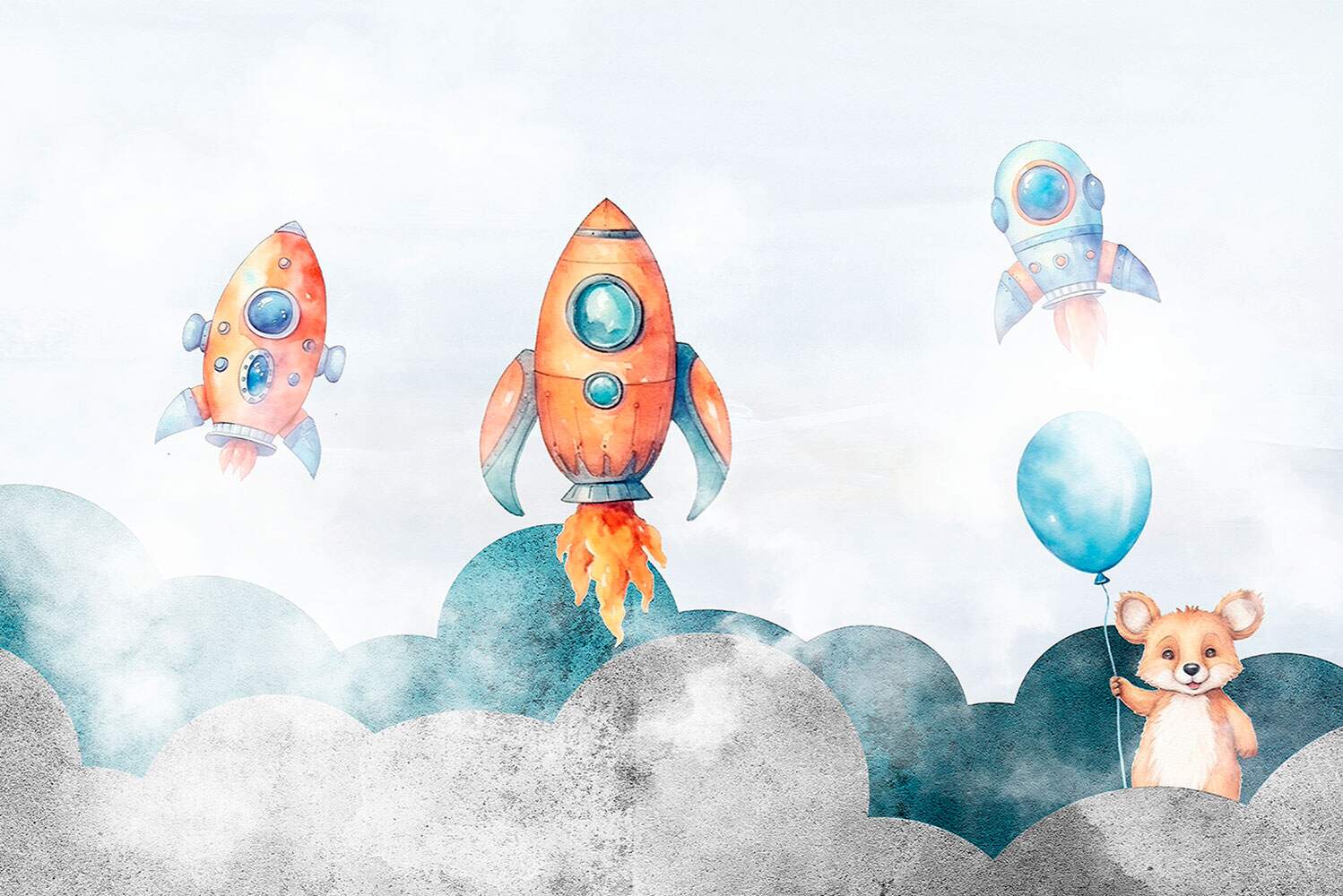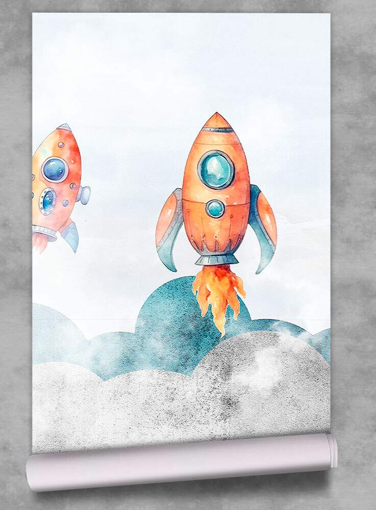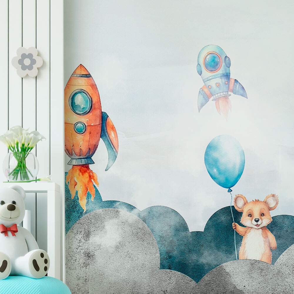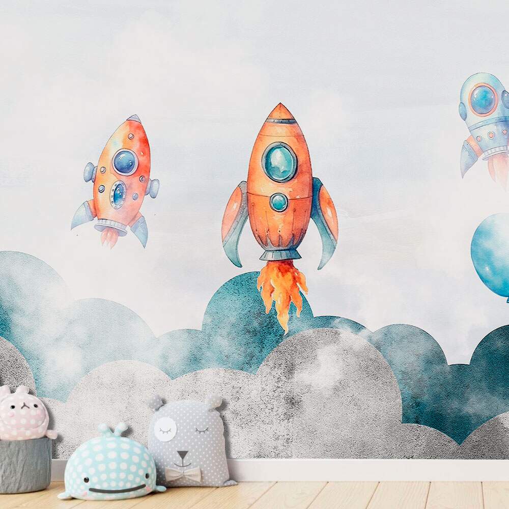 Papel de Parede para Quarto Infantil Aquarela Foguetes nas Nuvens MP