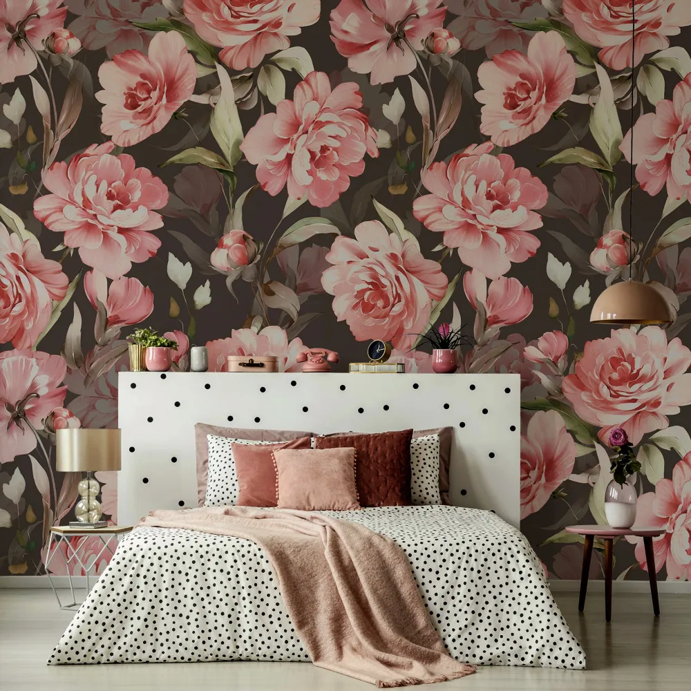 Papel de Parede Rosas Pink e Folhas Verdes MP