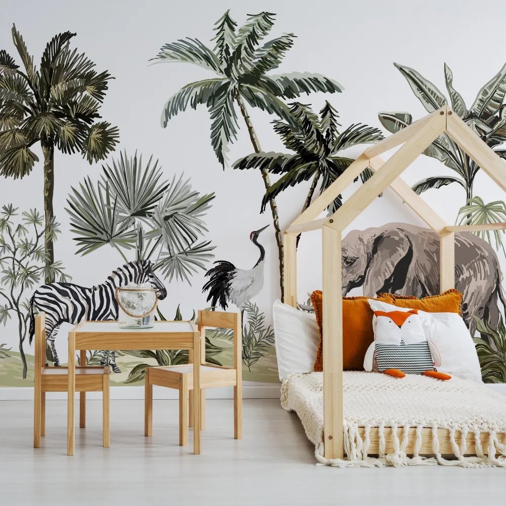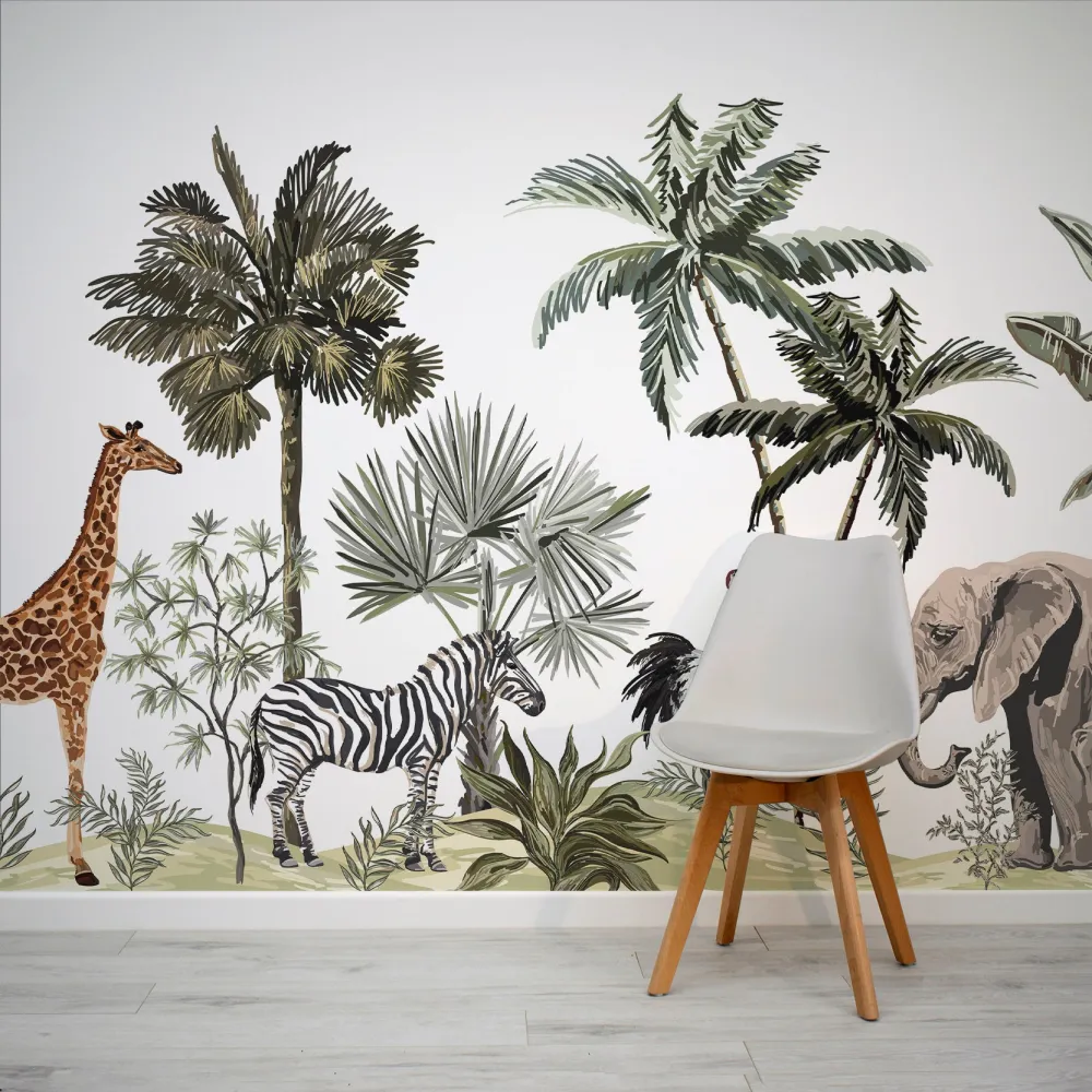 Transforme o quarto das crianças com este encantador papel de parede que retrata uma cena de safari com animais adoráveis como girafas, elefantes e zebras, rodeados por árvores exóticas. Com uma paleta de cores suaves, este mural cria um ambiente relaxante e divertido, perfeito para estimular a imaginação dos pequenos.