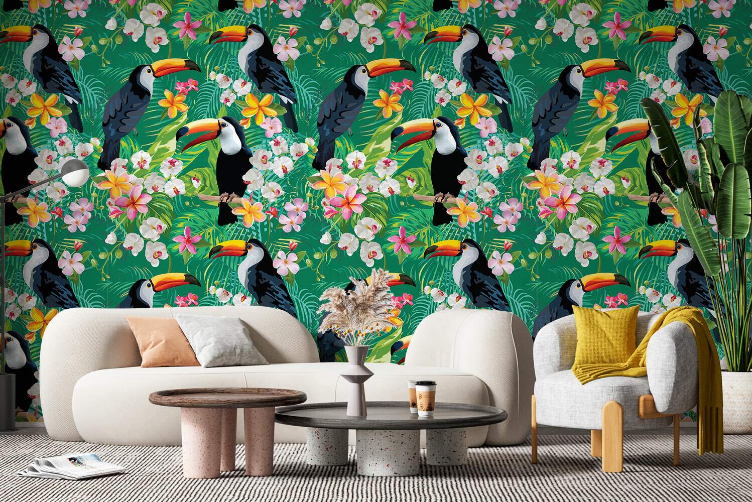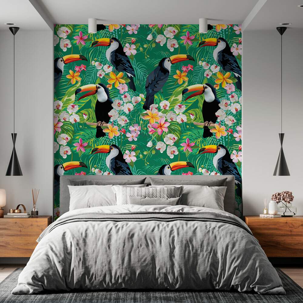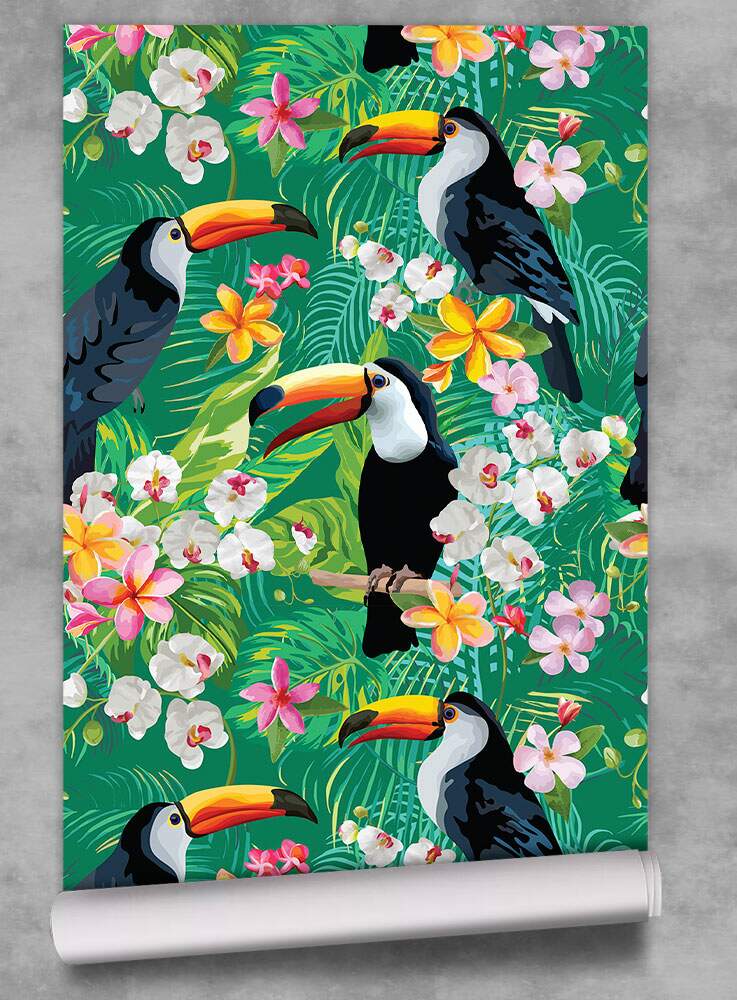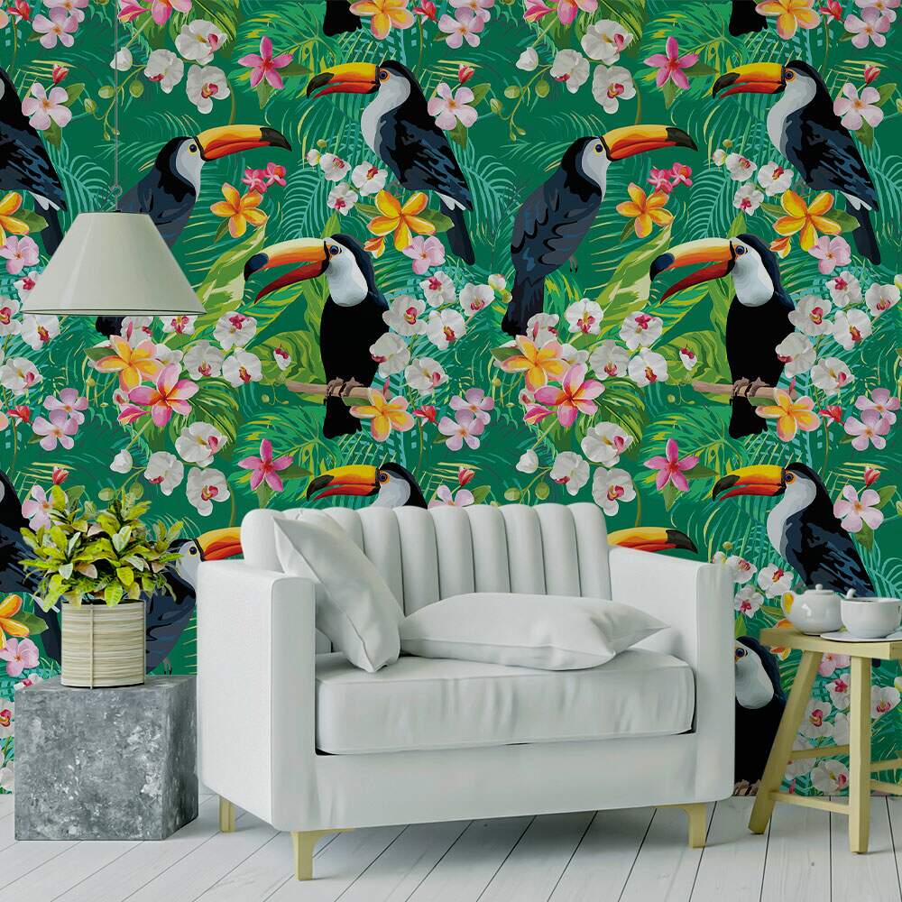 Papel de parede tropical com tucanos, flores vibrantes e folhagens verdes. Ideal para transformar ambientes com um toque exótico, alegre e cheio de natureza.