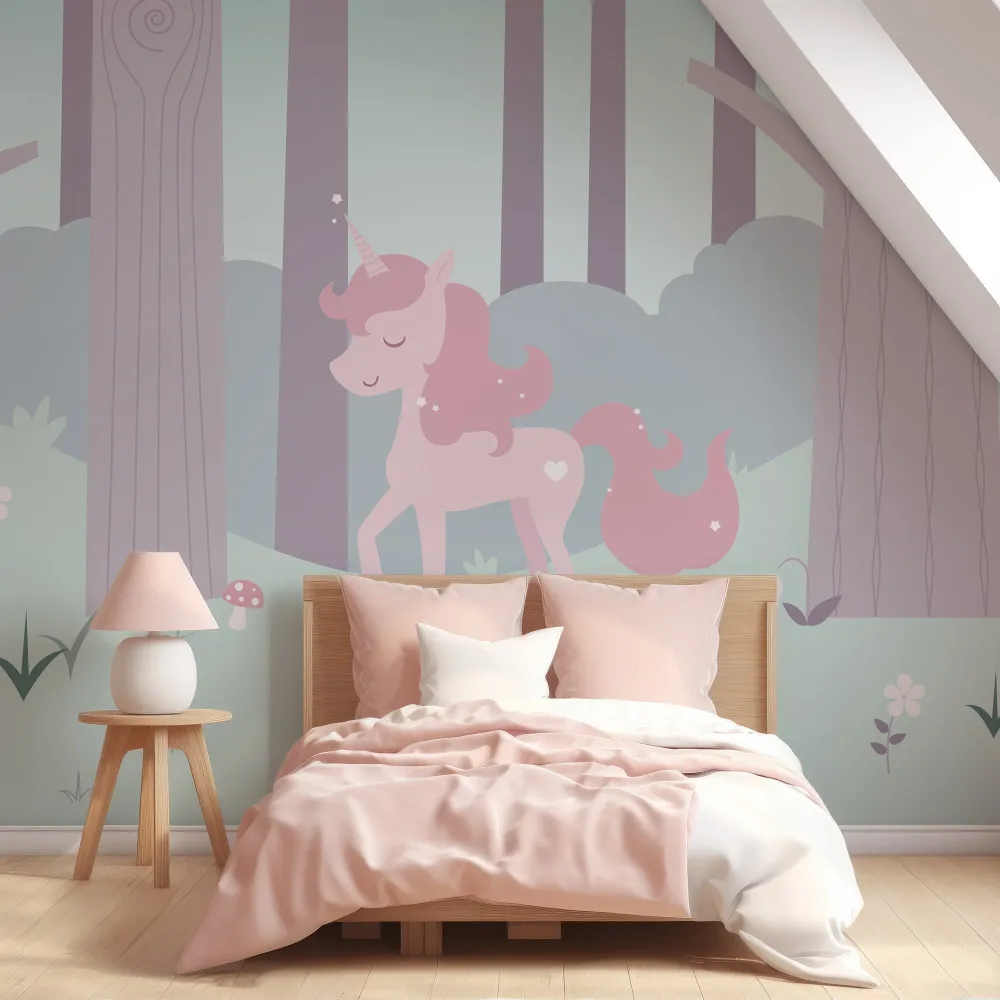 Papel de Parede Unicórnio Rosa na Floresta Mística MP