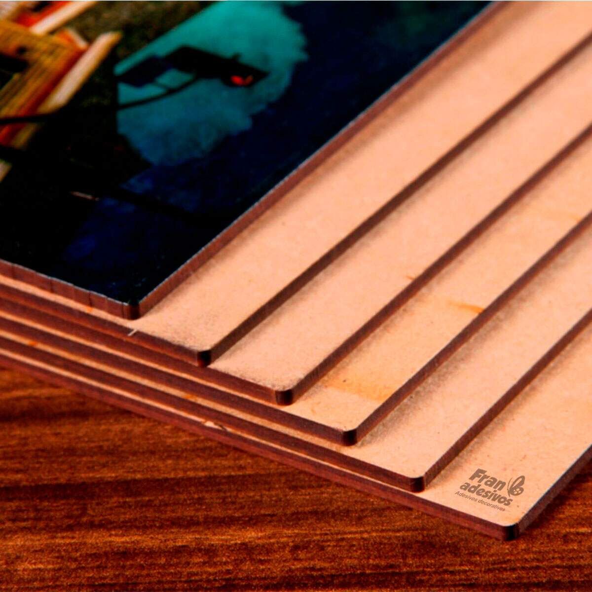 Placas em MDF com adesivo vinílico fosco de 0,10mm. O corte a laser pode criar marcas sutis em tons mais claros, conferindo um charme rústico ao produto.