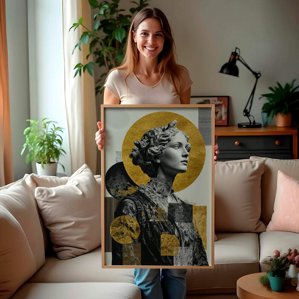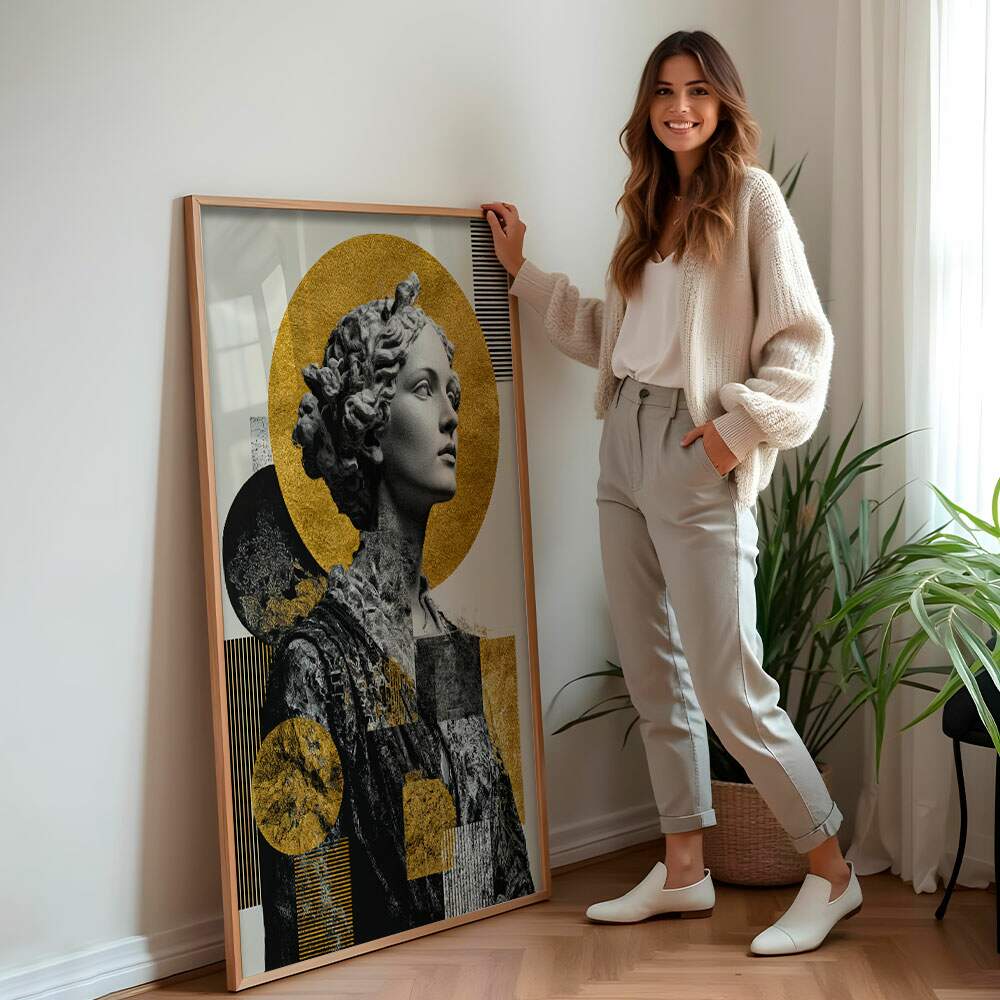 Quadro Decorativo Abstrato Estátua Collage Dourada