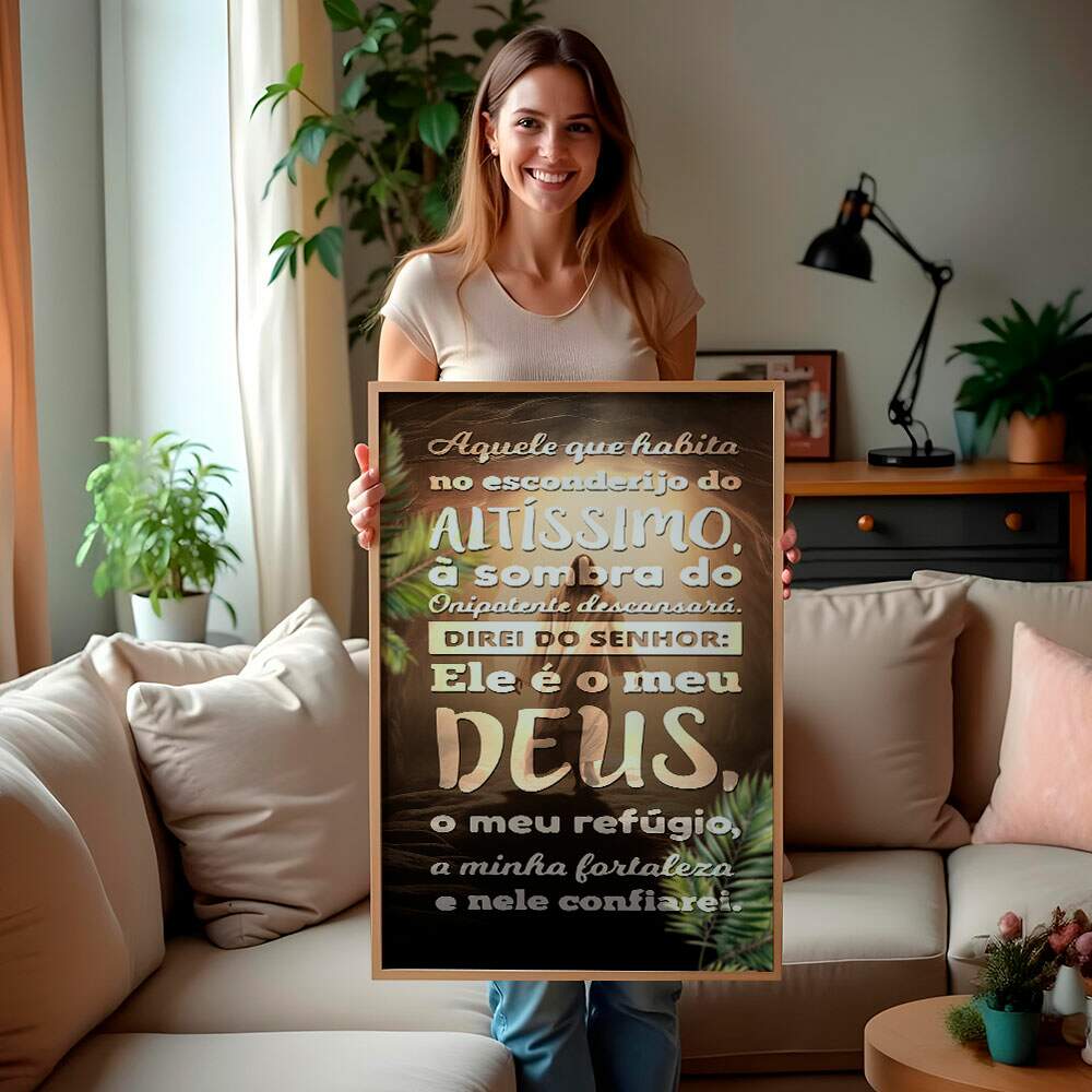 Encontre a paz e a inspiração que sua casa merece com nosso Quadro Decorativo, que traz a poderosa mensagem "Aquele que habita no esconderijo do Altíssimo". Com um design elegante em fundo suave e elementos naturais, esta peça é perfeita para momentos de contemplação, fortalecendo a conexão espiritual e decorando seu lar com amor e fé.