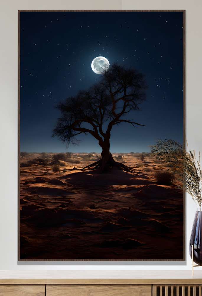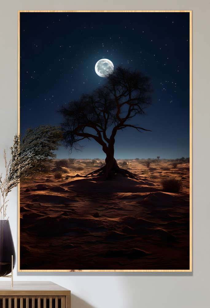 Este quadro decorativo retrata uma majestosa árvore solitária em contraste com um fundo de lua cheia, criando uma atmosfera misteriosa e serena. Com um céu noturno estrelado e a luz suave da lua, a imagem proporciona um cenário etéreo, perfeito para aqueles que apreciam a beleza da natureza e a tranquilidade das noites ao ar livre. Renove o seu ambiente com esse tema encantador, que certamente trará uma sensação de calma e contemplação para o seu espaço. Ideal para quem busca conectar-se com a harmonia da natureza e trazer um toque de magia para a decoração. Transforme a sua casa em um refúgio de serenidade com este quadro decorativo único.