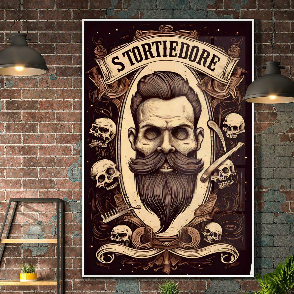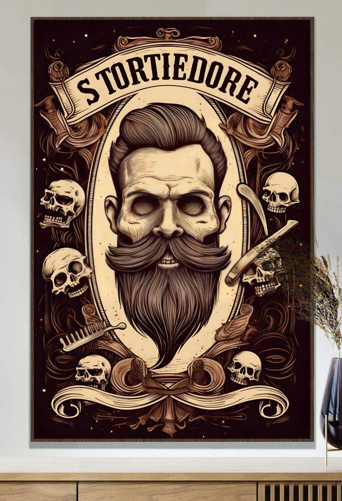 Este quadro decorativo de barbearia apresenta uma face de caveira rodeada por crânios e utensílios de corte, como navalhas e pentes, criando uma atmosfera única e cheia de personalidade. Os crânios simbolizam a mortalidade e adicionam um toque macabro e misterioso à decoração. Perfeito para quem busca um estilo vintage e dark, este quadro traz um ar ousado e estiloso ao ambiente, sendo ideal para decorar salões de barbearia ou espaços que buscam um visual diferenciado e marcante. Adicione personalidade ao seu espaço com este incrível quadro decorativo.
