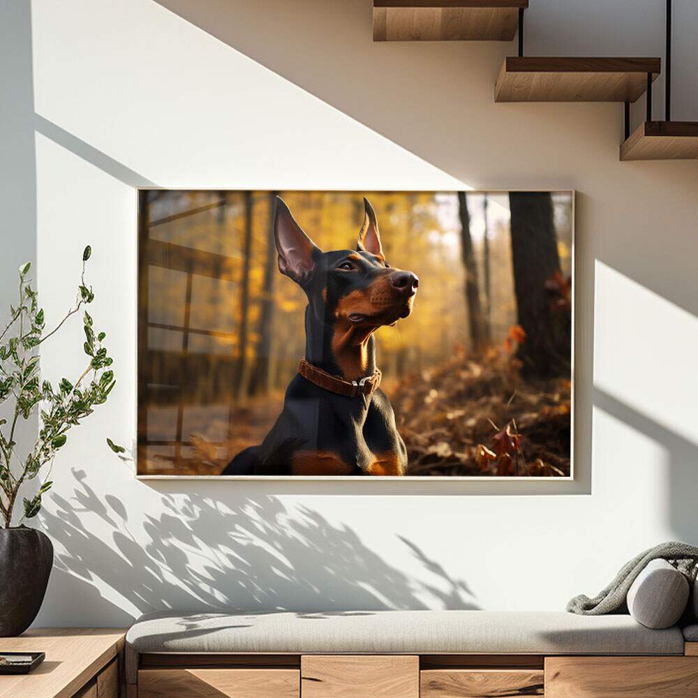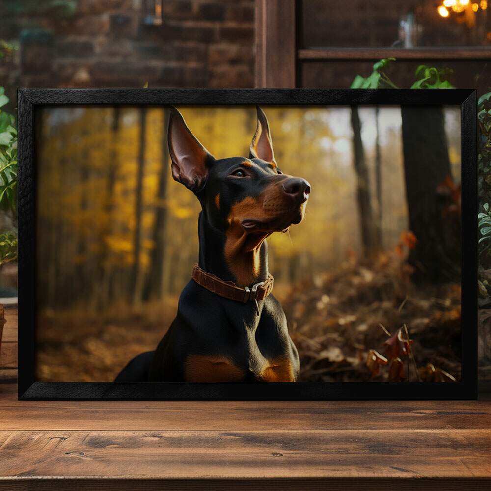 Este quadro decorativo retrata o majestoso Cão Doberman em sua melhor forma, destacando sua elegância e alerta característicos. Com origem na Alemanha, os Dobermans são reconhecidos por sua inteligência e lealdade, sendo frequentemente escolhidos como cães de guarda. Na imagem, o Doberman se destaca na floresta outonal, mostrando sua natureza vigilante em harmonia com a natureza ao redor. Adquira este quadro para decorar sua casa com sofisticação e personalidade, expressando seu amor por essa raça única.