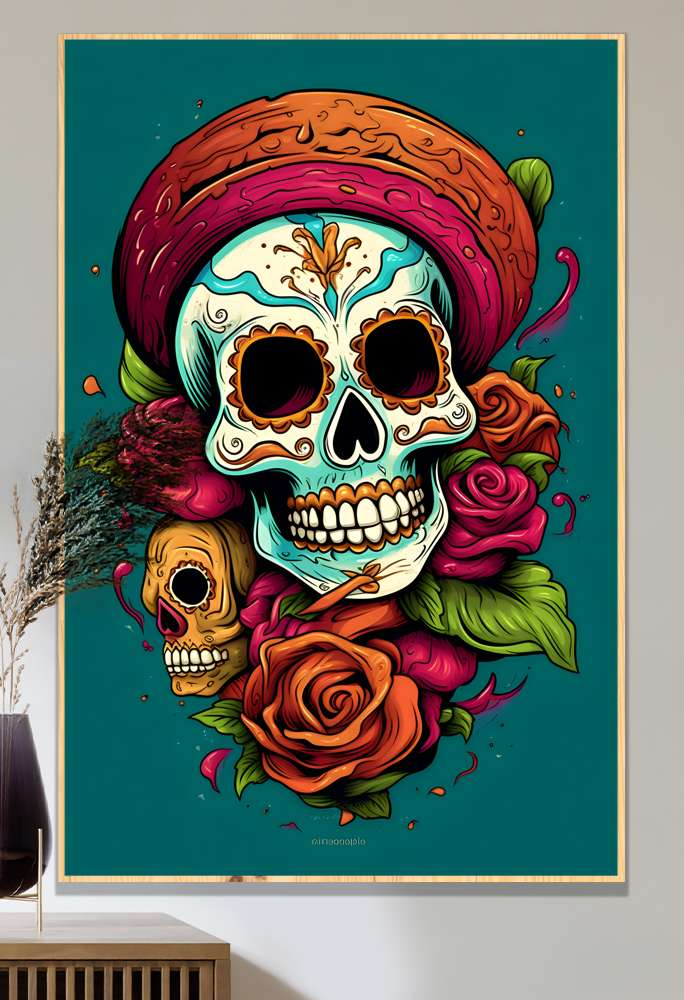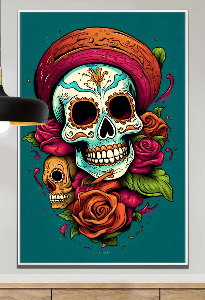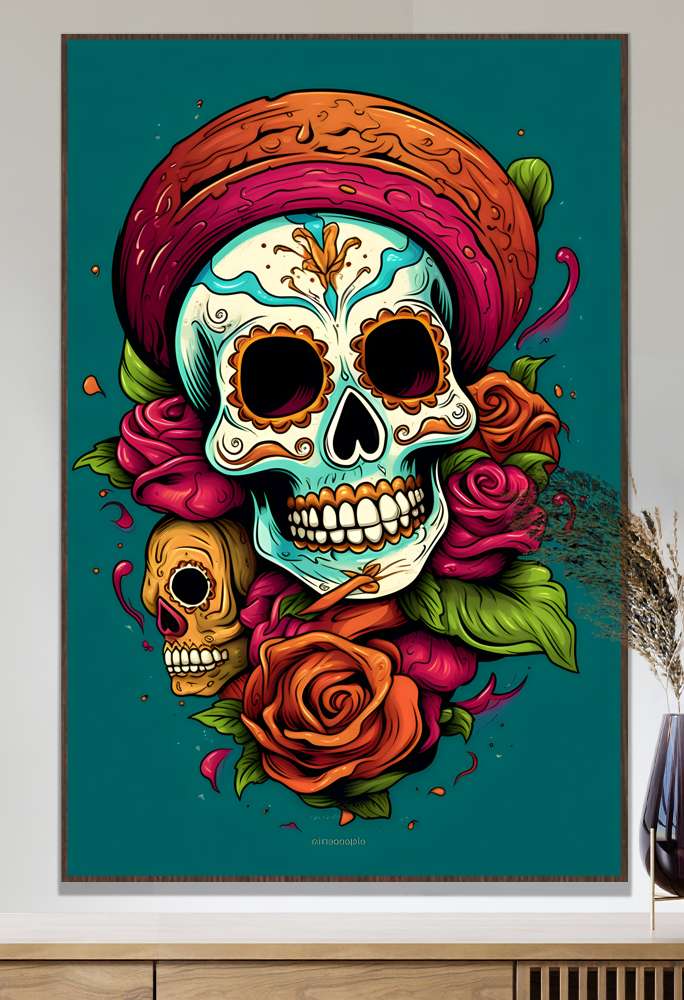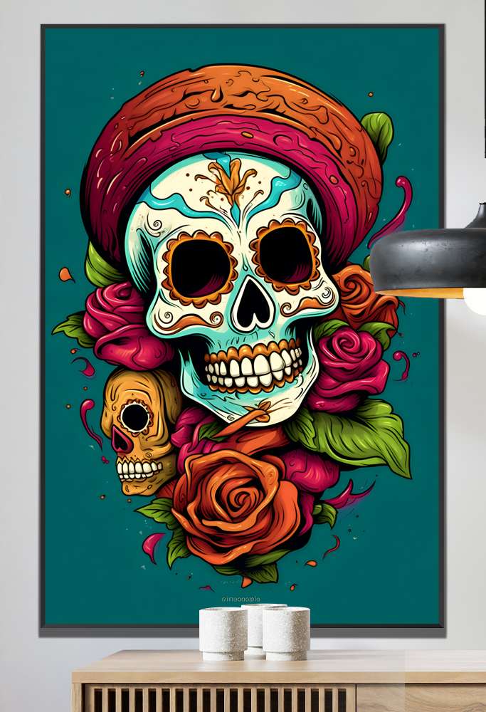 Celebre a vida e a alegria com este incrível Quadro Decorativo de Caveira Mexicana! Com detalhes em tons vibrantes de azul sobre um fundo verde elegante, esta peça é inspirada no tradicional símbolo do Dia dos Mortos. As flores e padrões intricados na caveira trazem consigo a energia da continuidade da existência. Adicione um toque de cultura e significado ao seu ambiente com este quadro único e cheio de simbolismo.