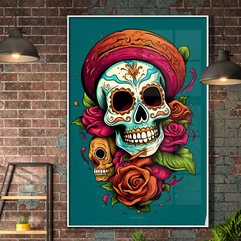 Quadro Decorativo Caveira Mexicana Com Detalhes Azuis Fundo Verde