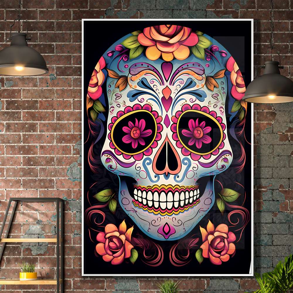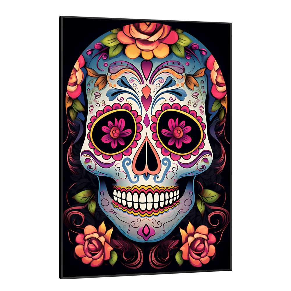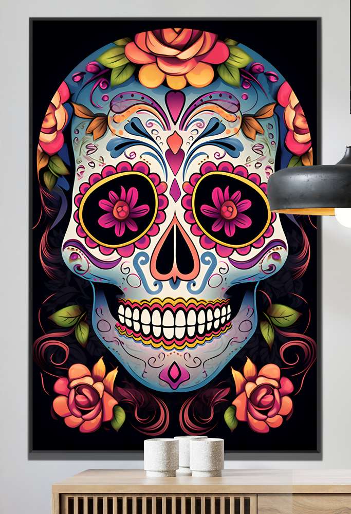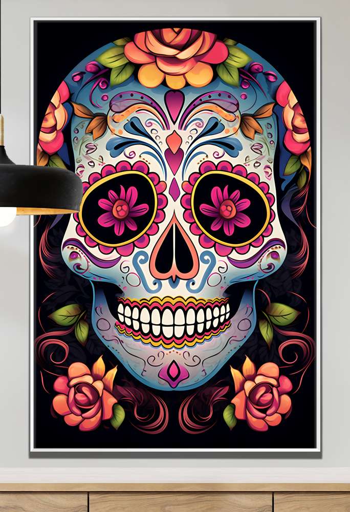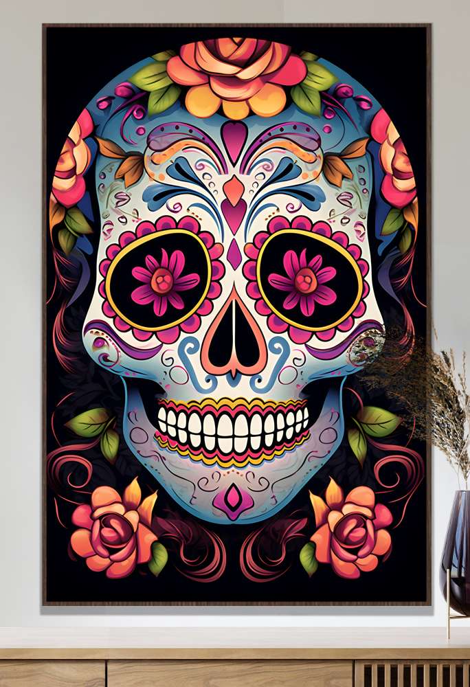 Quadro Decorativo Caveira Mexicana Com Flores e Detalhes Rosas e Azuis
