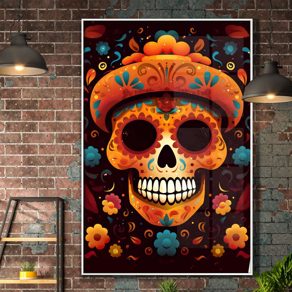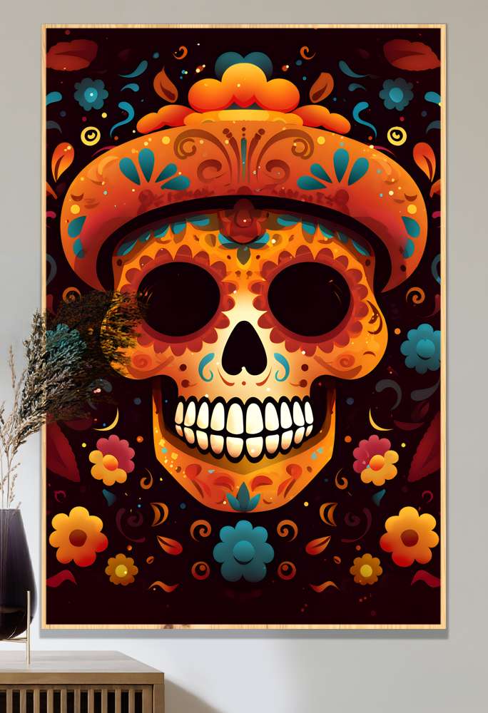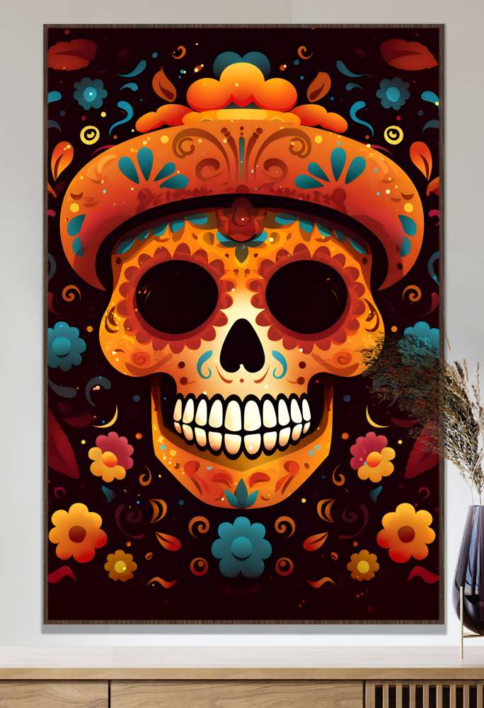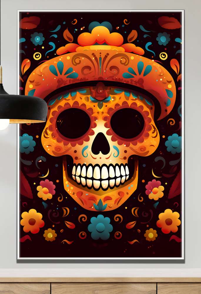 Celebre a vida com o Quadro Decorativo Caveira Mexicana Laranja Com Detalhes Azuis Fundo Preto. As caveiras mexicanas, conhecidas como 'calaveras', são símbolos vibrantes do Dia dos Mortos, uma festividade que celebra os falecidos com alegria e música. Com cores e detalhes marcantes, essas caveiras representam a conexão entre a vida e a morte. Traga toda a energia e o esplendor cultural das caveiras mexicanas para o seu espaço com esse quadro decorativo único.