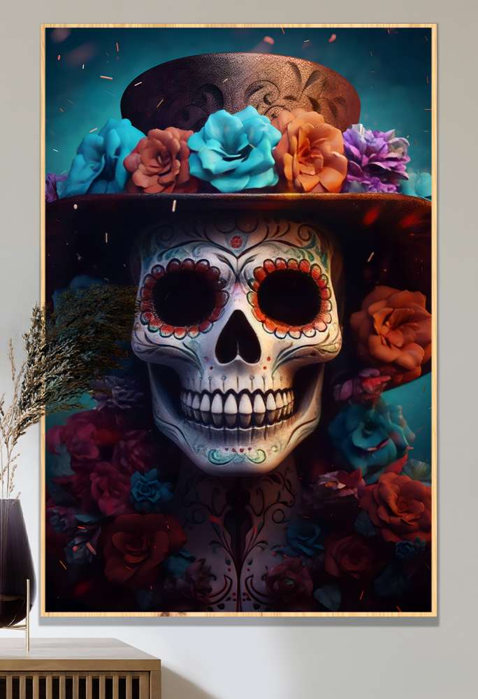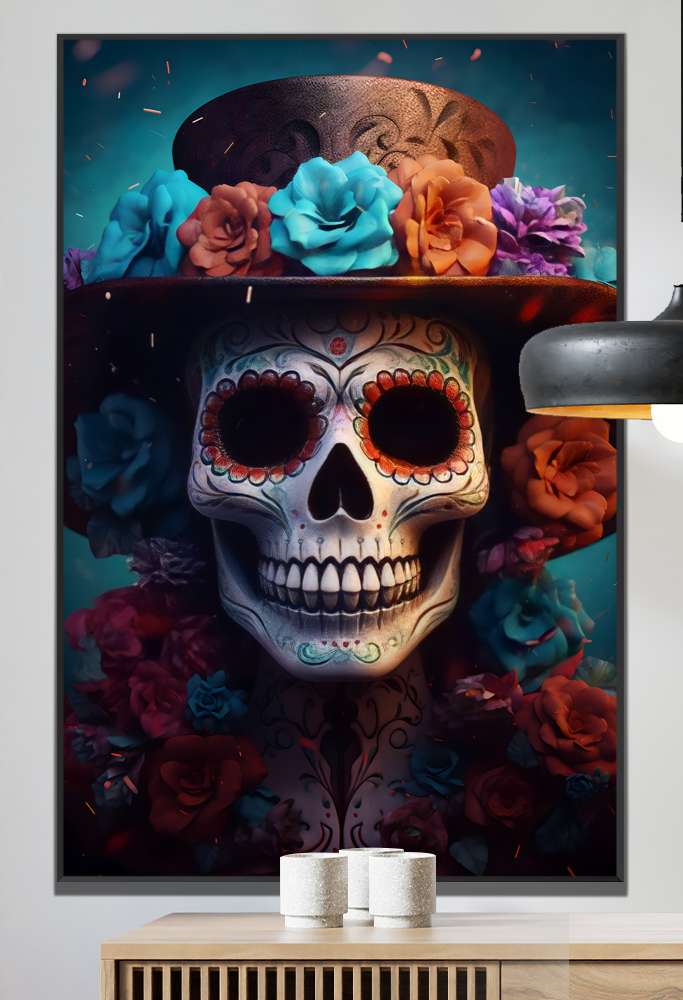 Celebre a vida e a cultura mexicana com este incrível Quadro Decorativo de Caveira Mexicana Realista com Chapéu de Flores. As caveiras mexicanas, ou 'calaveras', são símbolos coloridos e detalhados tradicionalmente associados ao Dia dos Mortos. Decoradas com flores e padrões vibrantes, representam a celebração da vida e a lembrança dos entes queridos. Adicione um toque especial e cheio de significado para a decoração da sua casa com este quadro único que traz consigo a riqueza cultural e o simbolismo das caveiras mexicanas.
