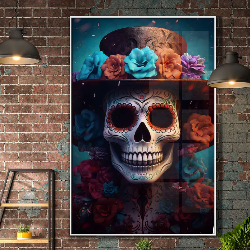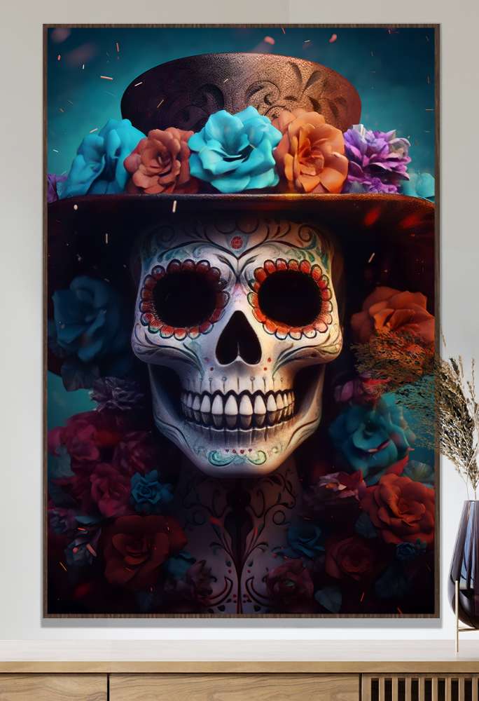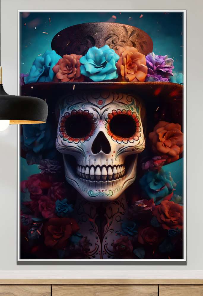 Quadro Decorativo Caveira Mexicana Realista Com Chapéu De Flores