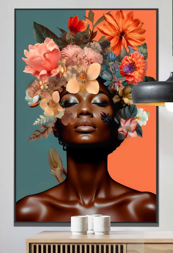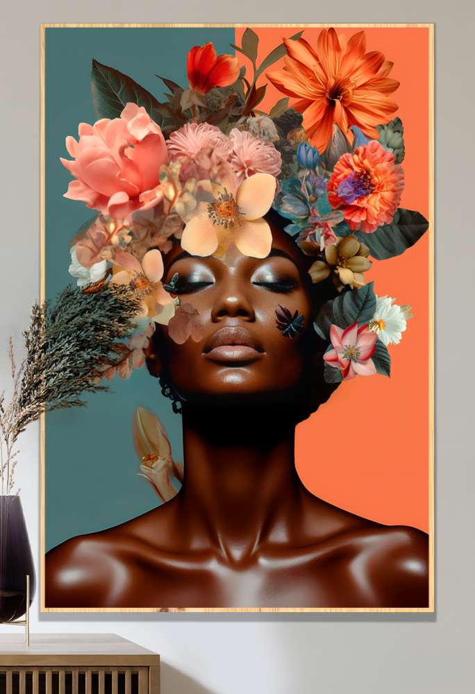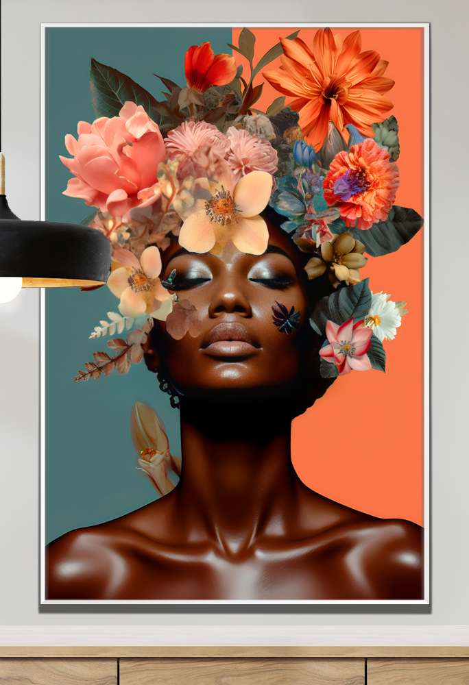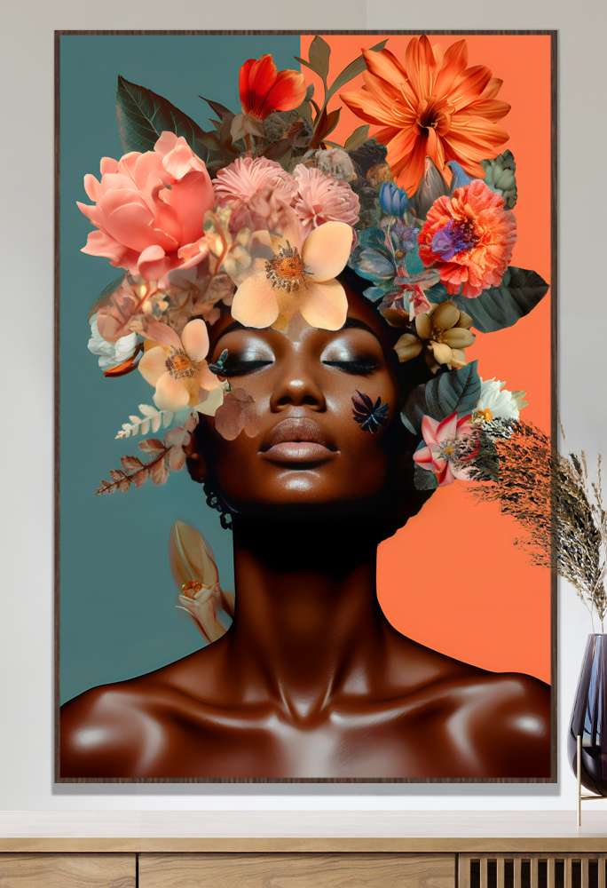 Quadro Decorativo Colagem de Flores Black Woman com Fundo Laranja e Verde