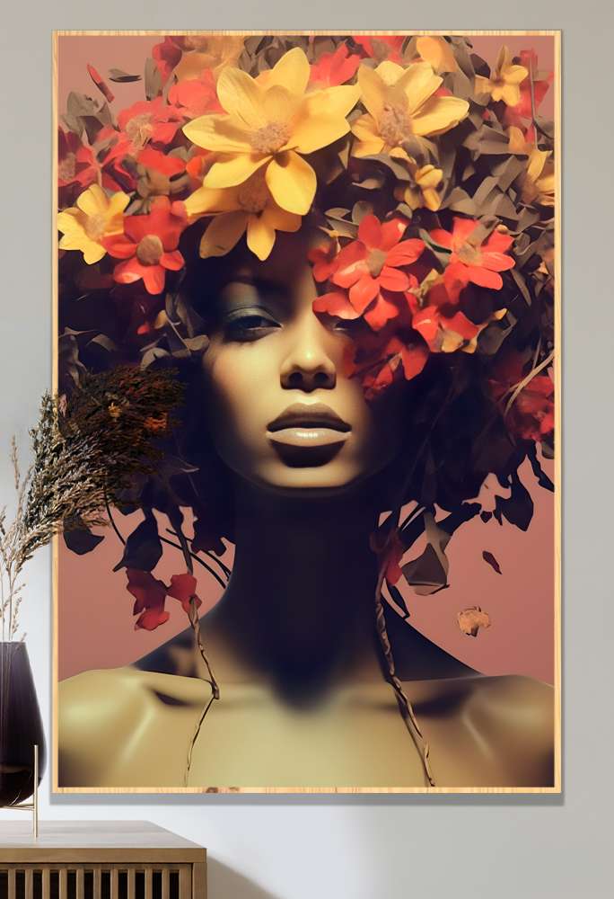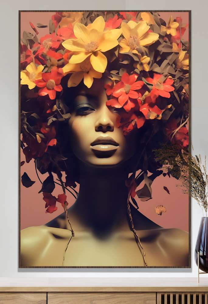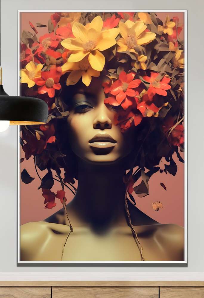 Este lindo quadro decorativo apresenta uma colagem artística única, que combina flores vibrantes e natureza exuberante com a beleza e a força de uma mulher negra. As flores em tons quentes de amarelo e vermelho se entrelaçam no cabelo, criando uma harmonia visual que simboliza crescimento e poder. Celebre a diversidade e a vida com essa peça cheia de significado e estilo para decorar o seu espaço com personalidade e beleza.