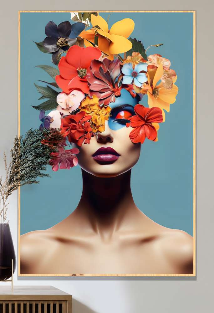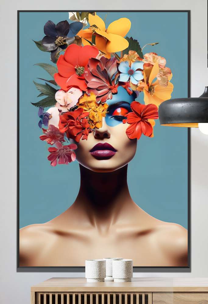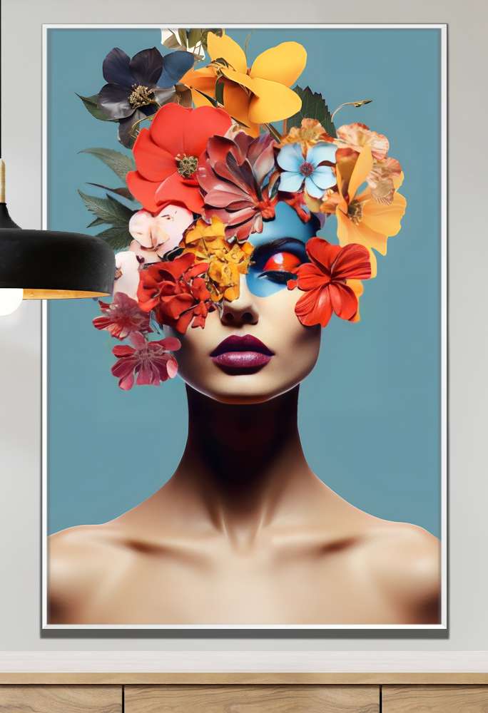 Este belíssimo quadro decorativo apresenta uma colagem única de flores em meio a uma mulher com maquiagem deslumbrante, em um fundo azul envolvente. As flores, símbolos de beleza e diversidade, se combinam de forma harmoniosa com a expressão humana, criando uma obra que encanta olhares e desperta emoções. Perfeito para decorar ambientes de quem aprecia a arte dos arranjos florais e a criatividade da maquiagem. Adicione charme e sofisticação à sua casa ou escritório com essa peça única e cheia de personalidade.