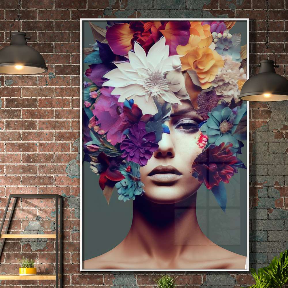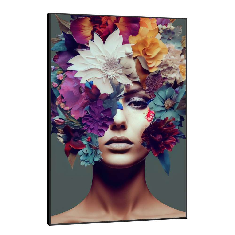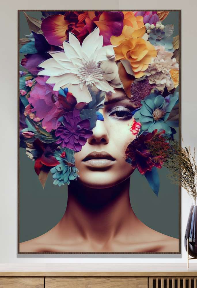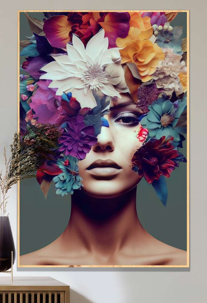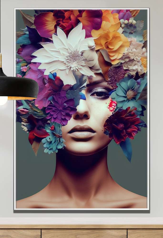 Quadro Decorativo Colagem de Flores em Mulher Tons de Roxo e Verde