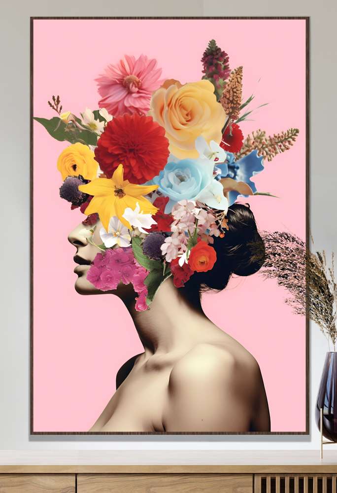 Quadro Decorativo Colagem de Flores em Perfil de Mulher