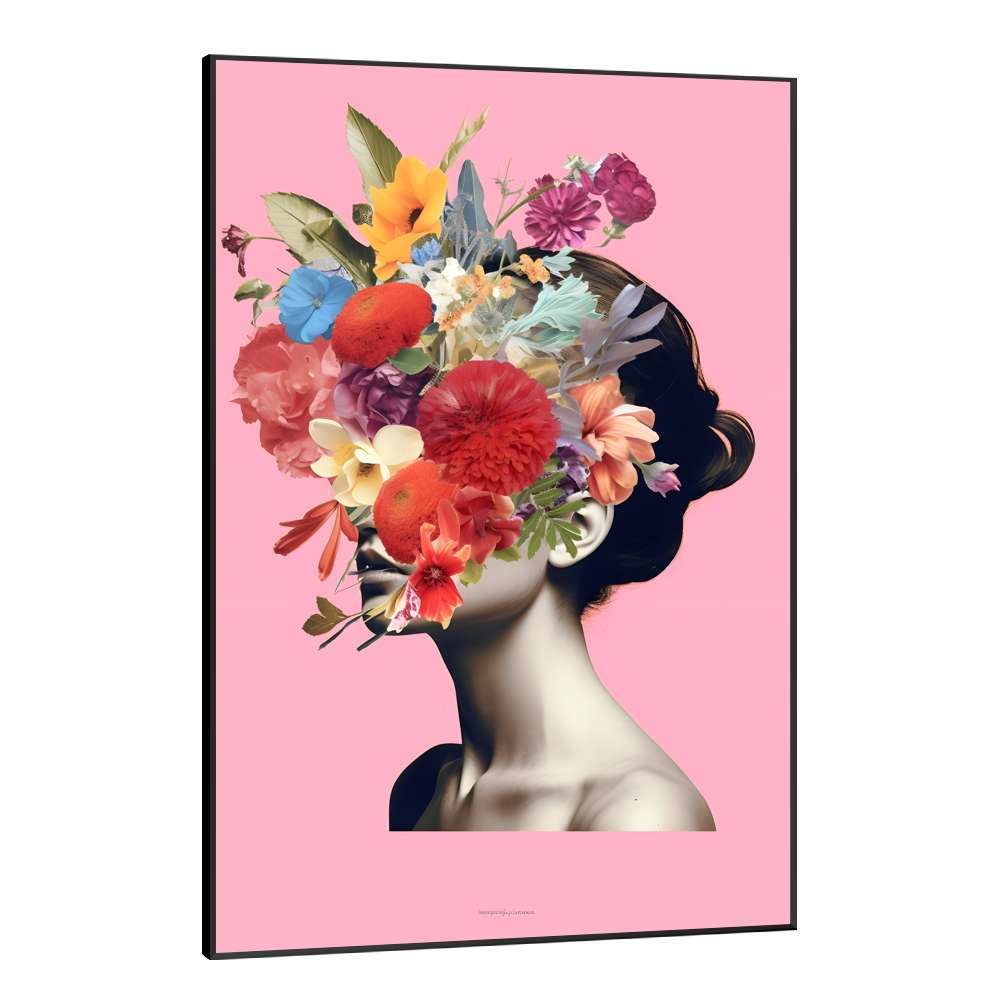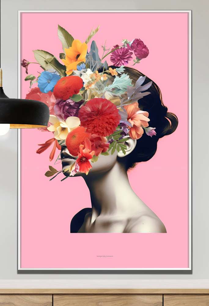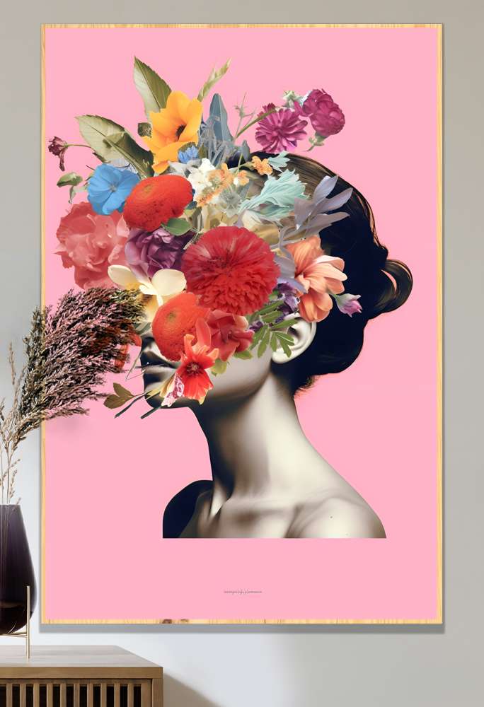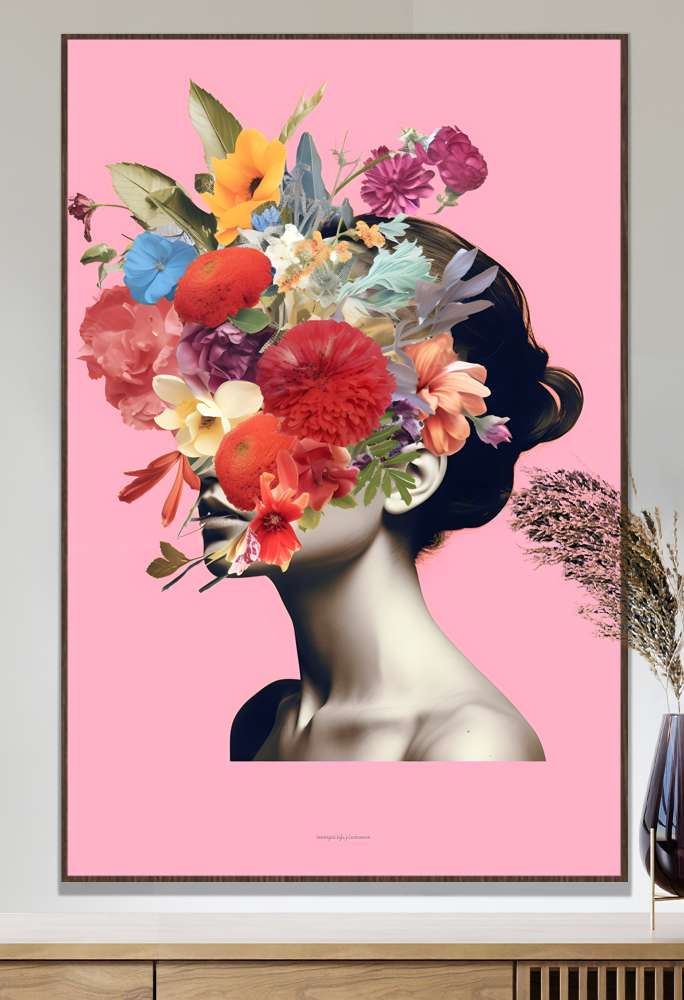 Quadro Decorativo Colagem de Flores em Rosto de Mulher Fundo Rosa