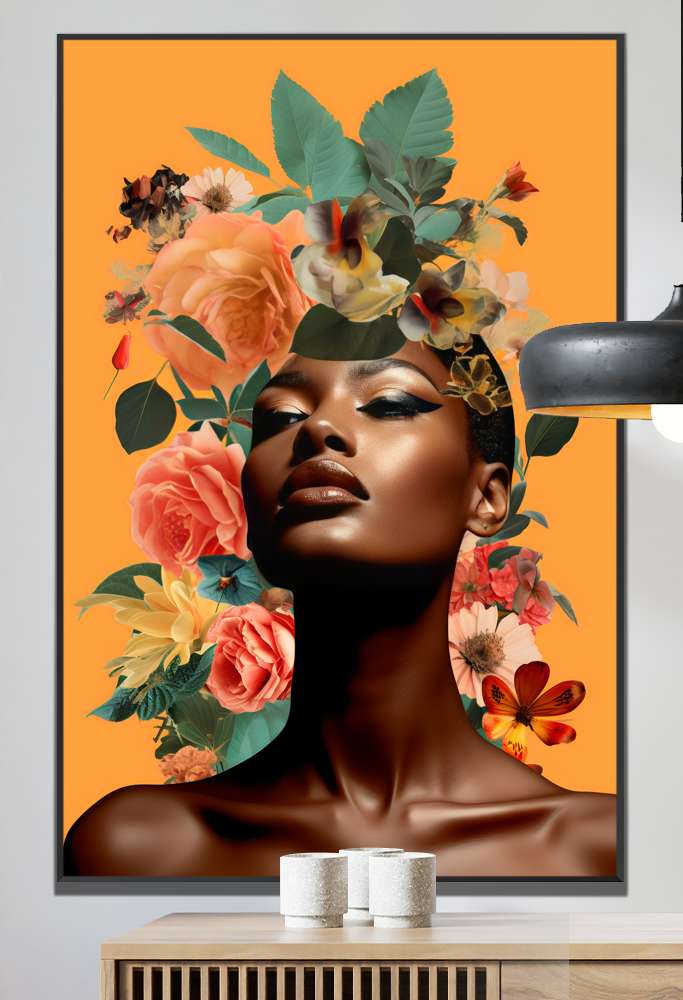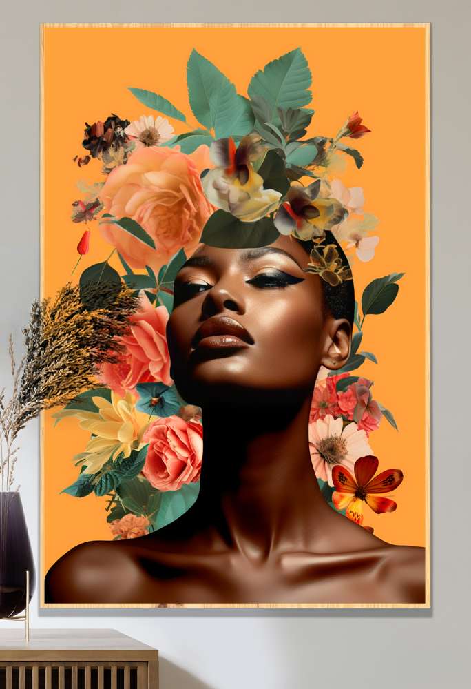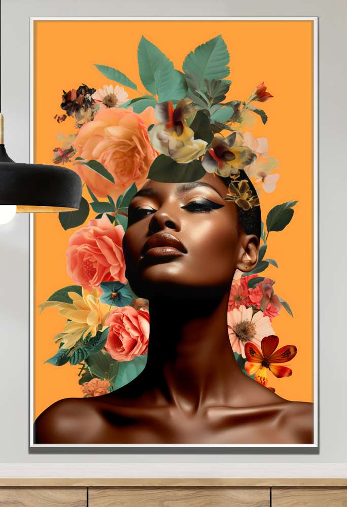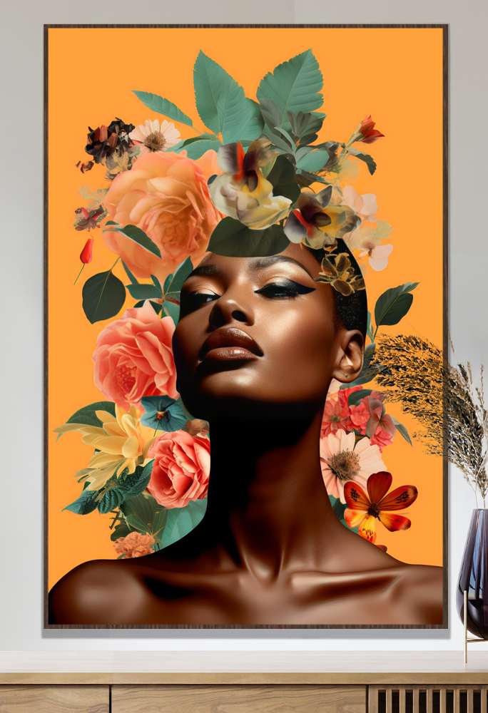 Quadro Decorativo Colagem de Flores no Fundo Amarelo Black Woman