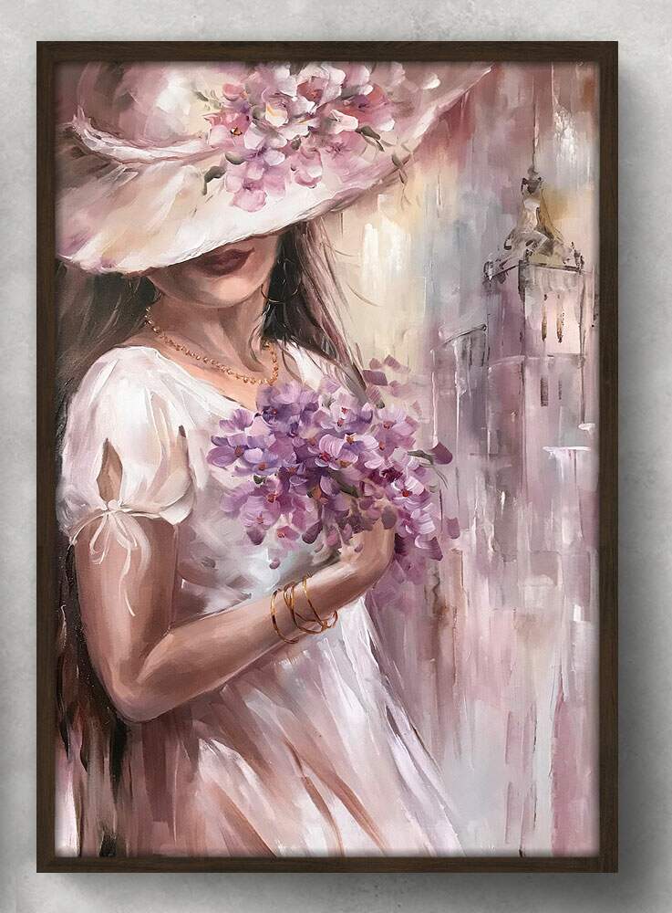 Decore o quartinho da sua filha com delicadeza e beleza natural com o Quadro Decorativo Collage Flowers Mulher de Chapéu com Flores. Com uma elegante mulher segurando um buquê de flores roxas, esta peça transmite serenidade e harmonia, capturando a suavidade e encanto das flores em uma composição artística única. Adicione um toque de charme e sofisticação ao ambiente com este quadro decorativo que combina perfeitamente com uma decoração estilo pintura em tons de roxo.