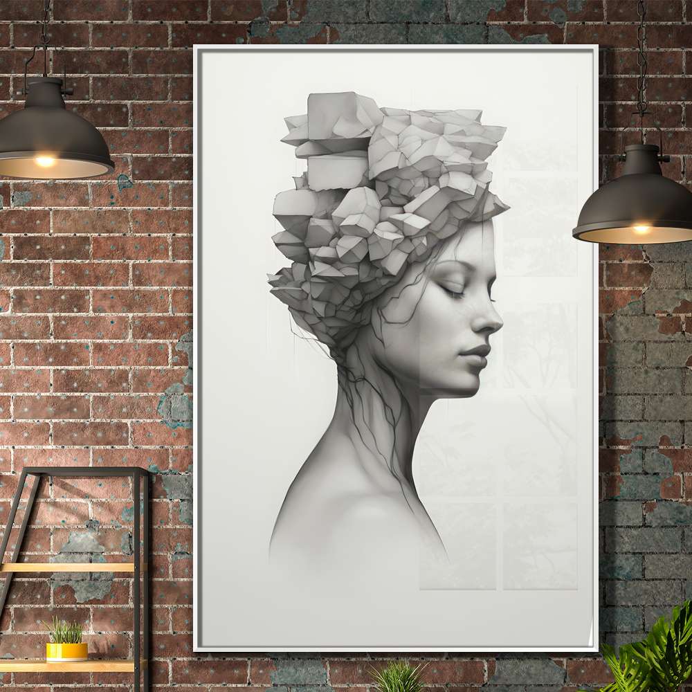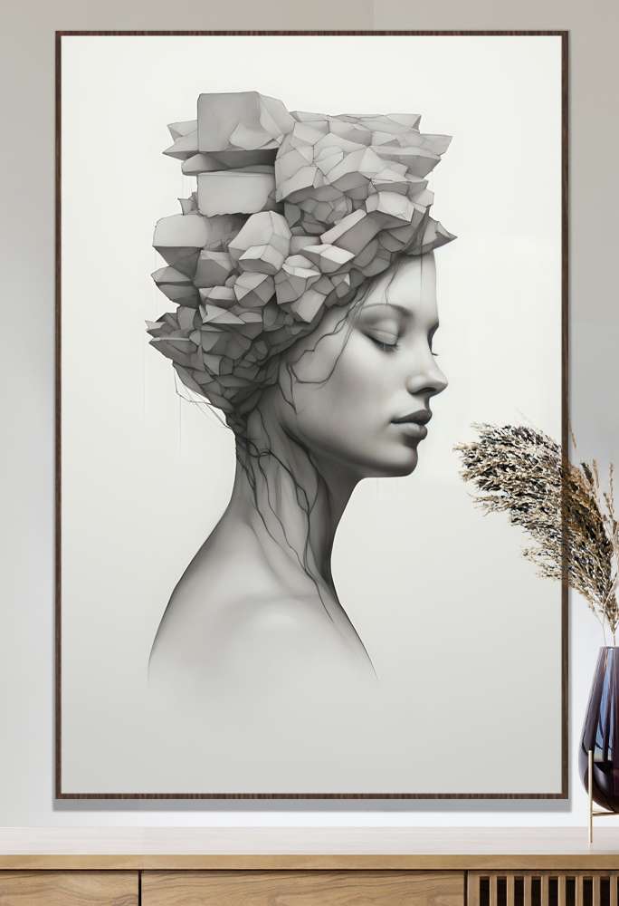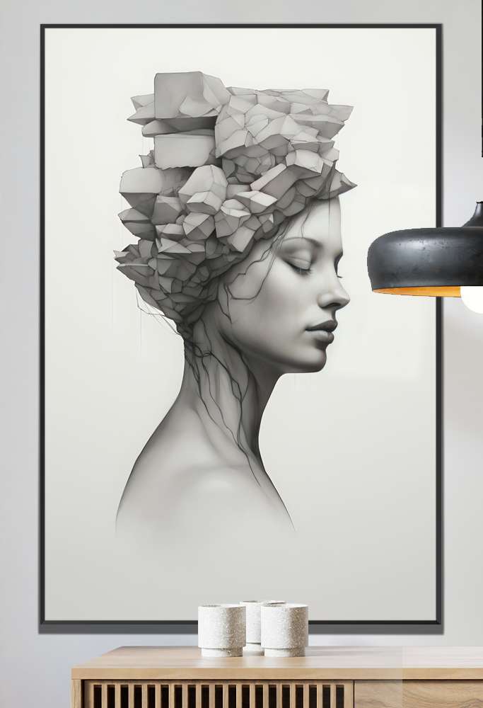 Esta obra de arte em forma de quadro decorativo traz a representação minimalista de uma mulher de pedra, combinando a beleza humana com a solidez da natureza. A delicada harmonia entre as formas orgânicas e os elementos geológicos simboliza tanto a força quanto a serenidade, adicionando um toque artístico e contemplativo a ambientes modernos. Ideal para quem busca uma peça única que inspire reflexão e conexão com a natureza. Transforme seu espaço com essa obra que transmite beleza e equilíbrio.