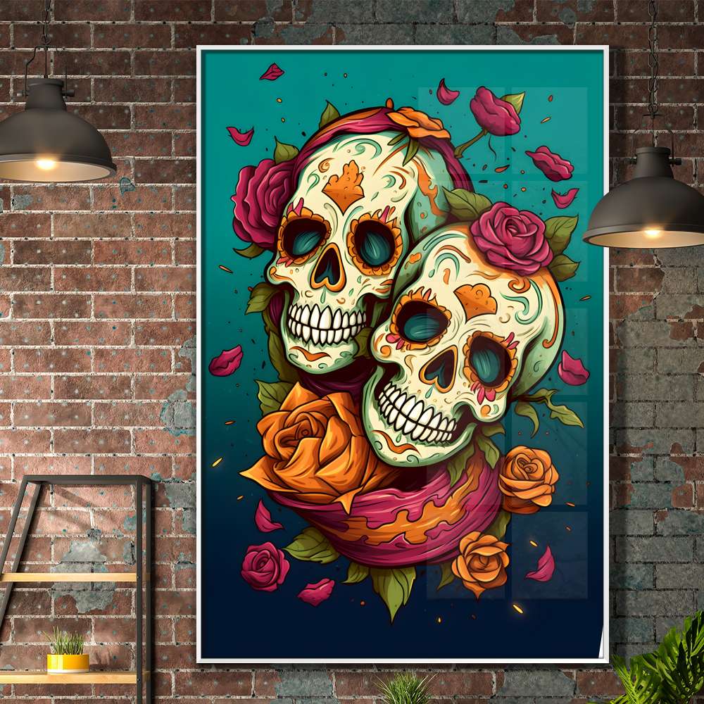 Quadro Decorativo Duas Caveiras Mexicanas Com Fundo Verde