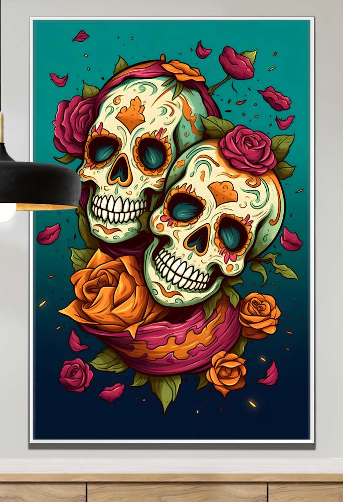 Celebre a vida e a memória dos entes queridos com este incrível Quadro Decorativo Duas Caveiras Mexicanas Com Fundo Verde. As caveiras mexicanas, conhecidas como calaveras, são símbolos tradicionais do Dia de los Muertos, com cores vibrantes e decorações elaboradas que encantam. Este quadro une a arte folclórica mexicana com um fundo verde exuberante, perfeito para trazer alegria e vivacidade para a decoração da sua casa. Adicione um toque de cultura e estilo a qualquer ambiente com esta peça única e cheia de significado.