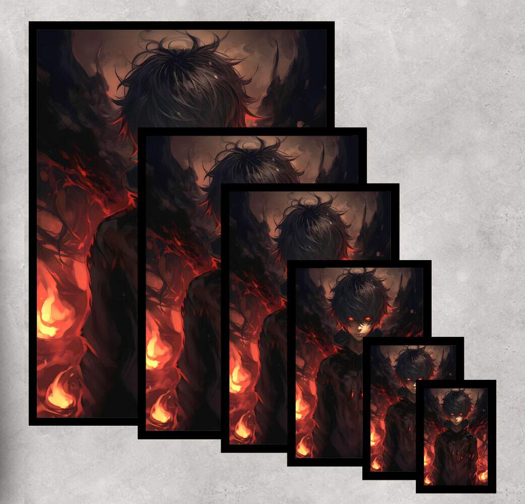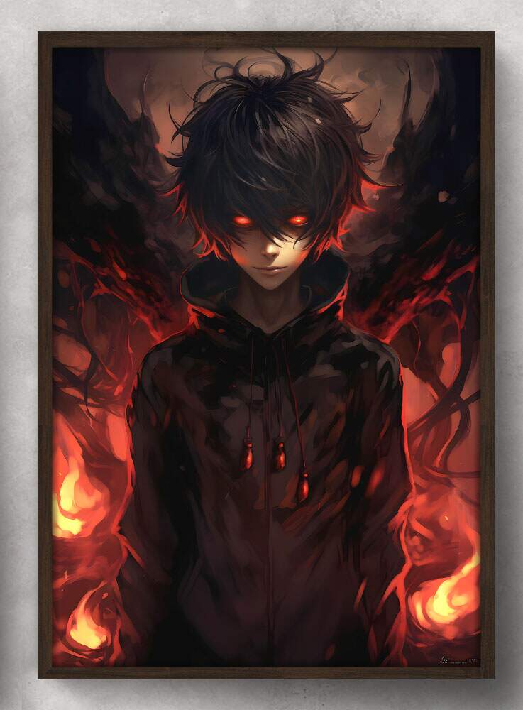 Quadro Decorativo Fã Arte Olhos Vermelhos Inspirado em Ryuk e Light: Transforme seu ambiente com este quadro decorativo inspirado nos personagens Ryuk e Light do anime ?Death Note?. Os olhos vermelhos brilhantes transmitem poder e mistério, adicionando um toque sombrio e intenso à sua decoração. Perfeito para os fãs de animes e mangás que buscam uma peça que represente a essência da série. Adquira já e deixe seu espaço mais dramático e único!