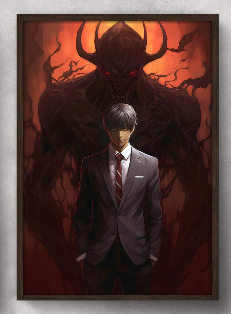 Retrata um personagem sombrio com um monstro assustador ao fundo, essa obra de arte traz à tona a dualidade entre luz e escuridão, poder e moralidade. Inspirado na icônica série 'Death Note', o quadro decorativo Fã Arte Sombra de Monstro desperta reflexões sobre as escolhas humanas e as consequências de lidar com forças sobrenaturais. Ideal para os fãs da série que desejam uma peça única e cheia de significado para decorar seu espaço com estilo e personalidade.