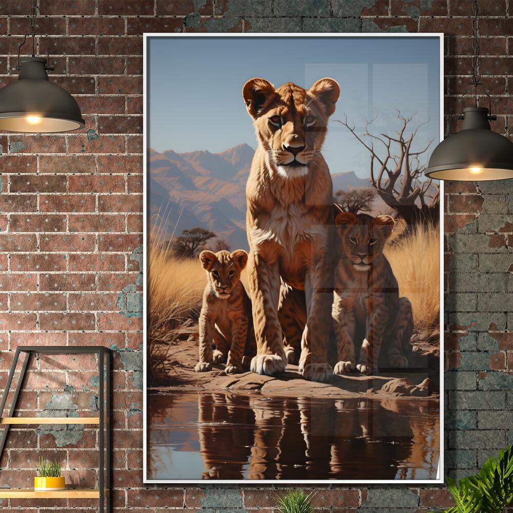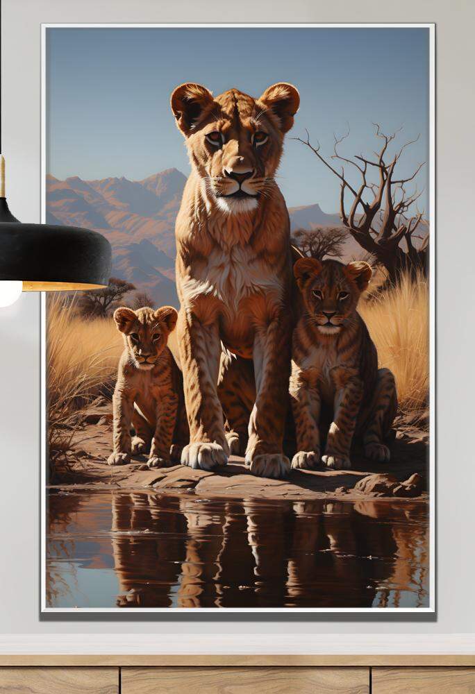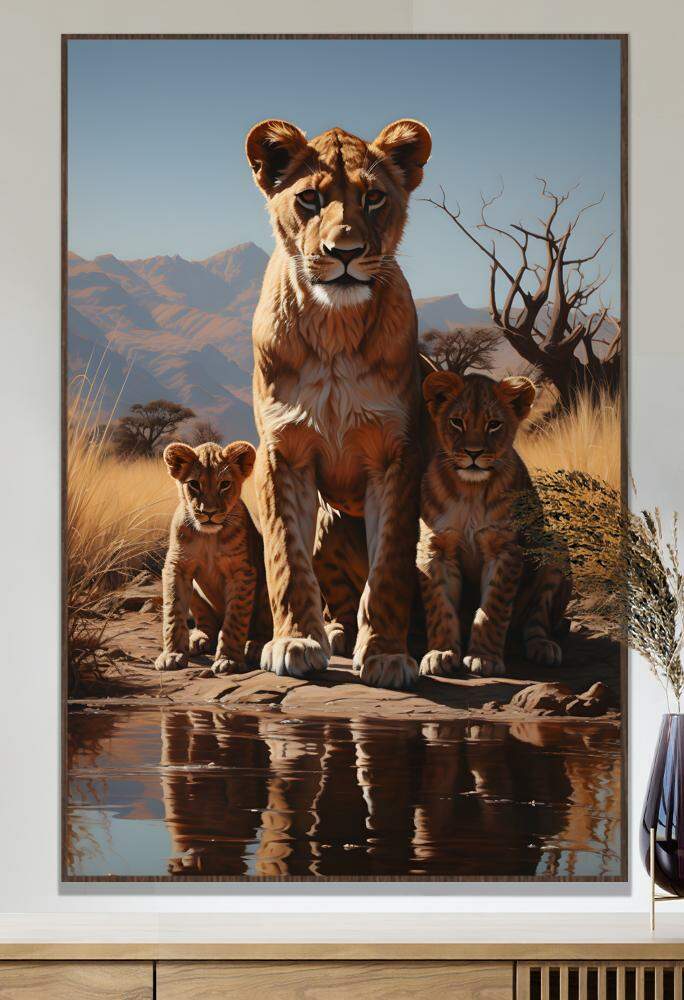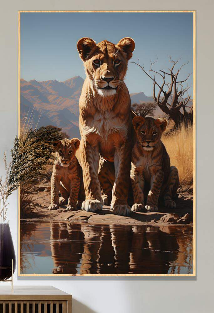 A beleza majestosa dos leões é capturada nesta cena de uma leoa com seus filhotes na savana africana. Iluminada pela luz do sol, a família de leoas exala força e ternura, rodeada pela natureza exuberante e serena, com montanhas ao fundo e vegetação típica do ambiente selvagem. Ideal para quem busca uma decoração impactante e cheia de significado, este quadro decorativo traz toda a majestade e a conexão familiar dos leões em seu habitat natural. Transforme seu ambiente em um espaço acolhedor e cheio de personalidade com essa obra de arte inspiradora.