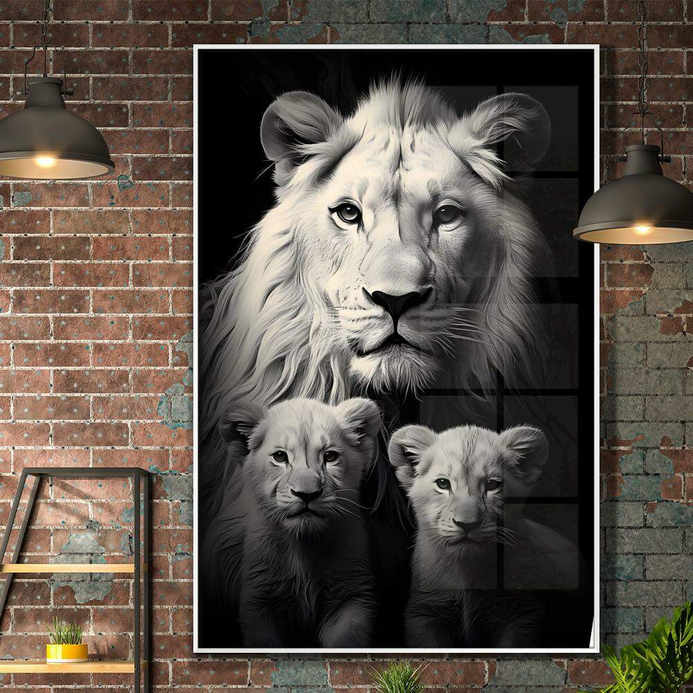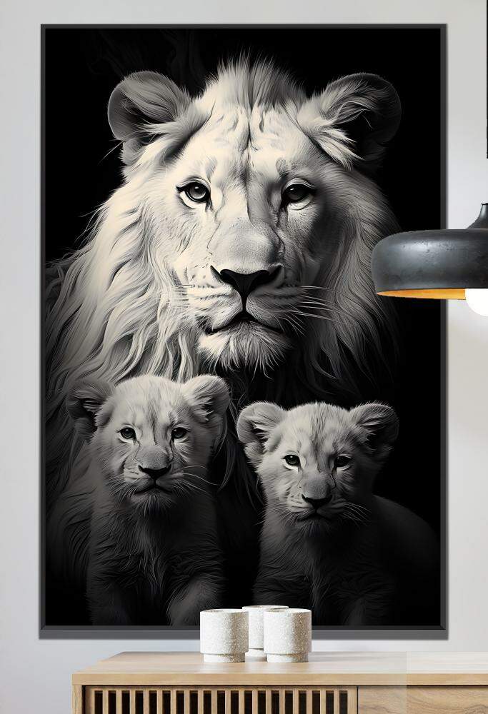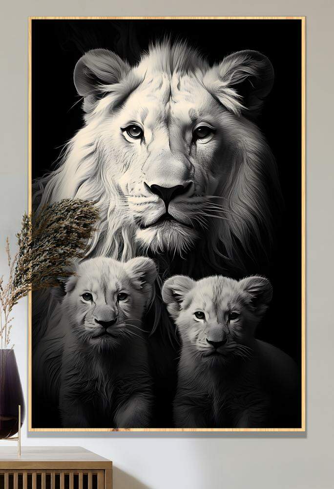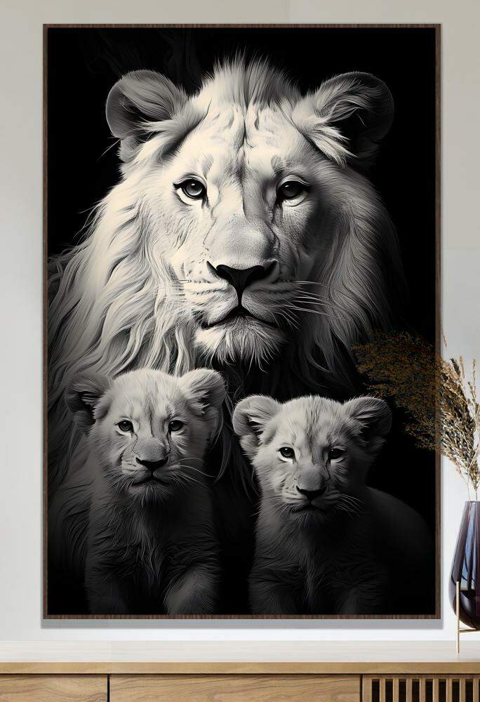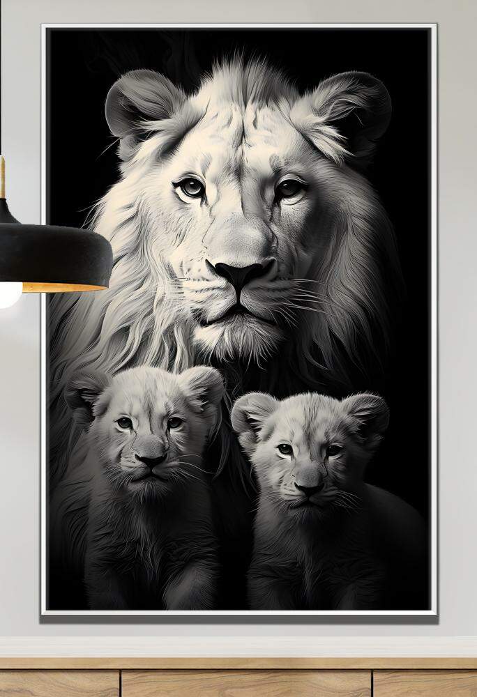 Este quadro decorativo em preto e branco retrata uma família de leões esbeltos, destacando a imponência do leão adulto e a inocência dos filhotes. Com uma imagem que transmite força, proteção e laços familiares presentes no reino animal, ele traz uma sensação de poder e ternura ao seu ambiente. Ideal para quem busca um toque de elegância e simbolismo em sua decoração. Transforme seu espaço com a majestosidade dos reis da selva.