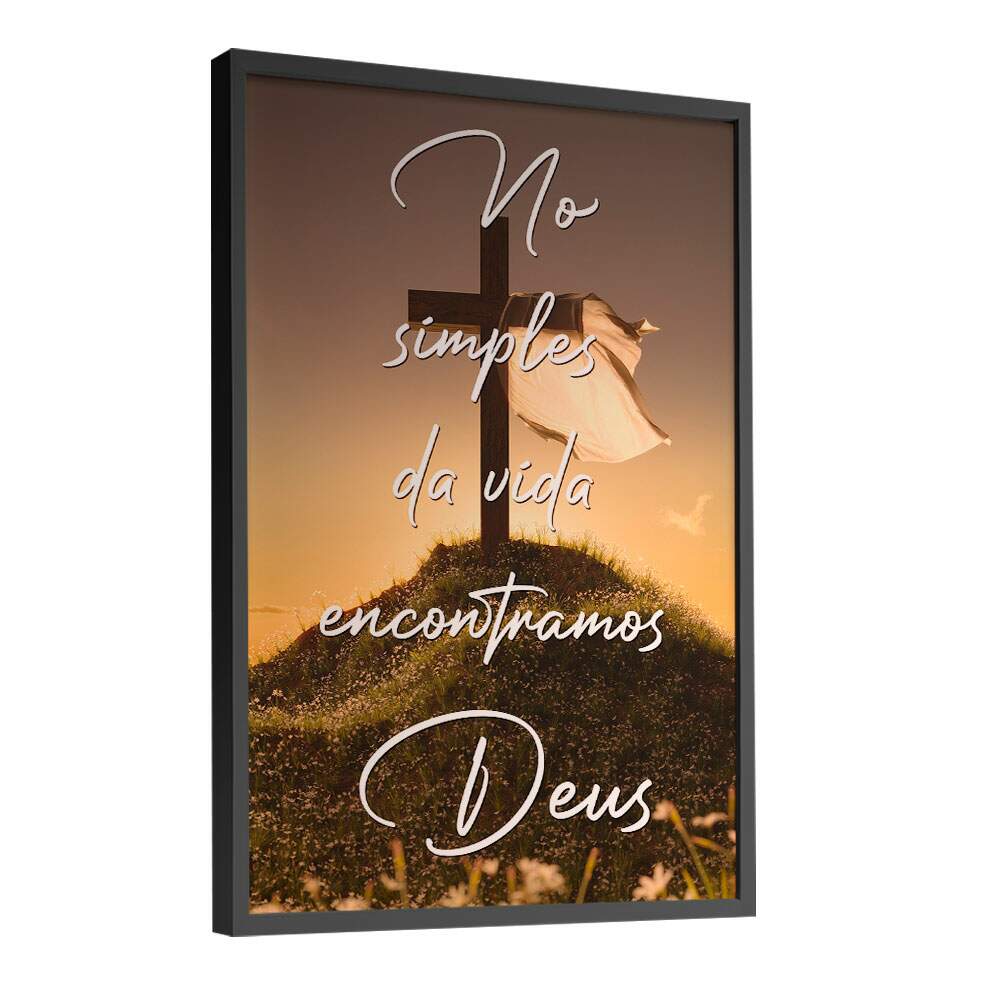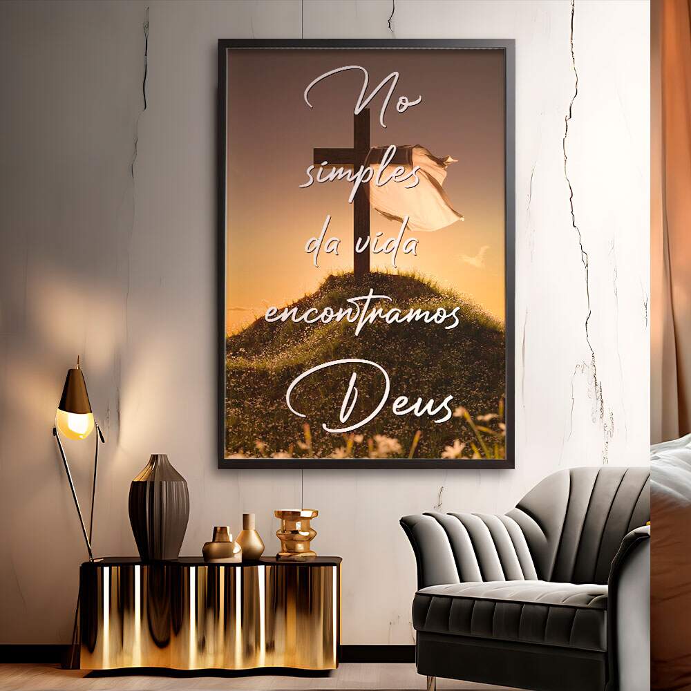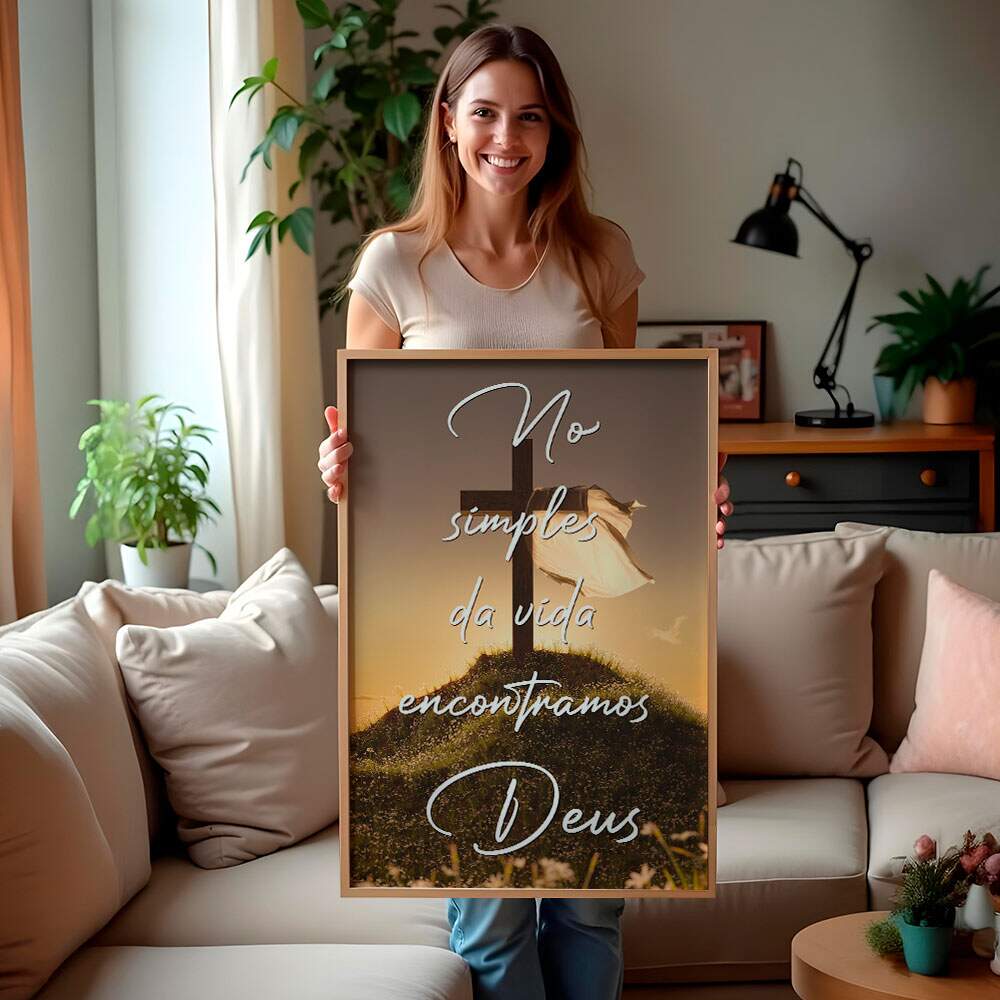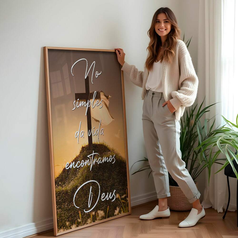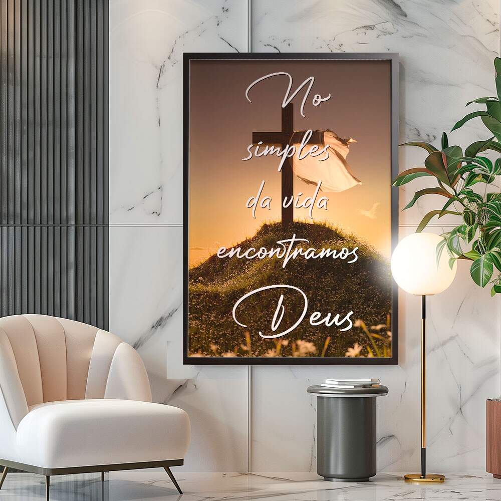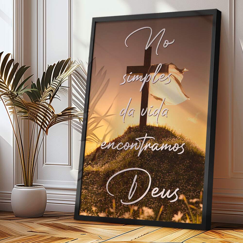 Transforme seu espaço com nosso Quadro Decorativo que retrata a serenidade da fé e a beleza da simplicidade. Com a frase inspiradora "No simples da vida encontramos Deus", este quadro evoca paz e renovação, perfeito para momentos de reflexão. Deixe a luz do pôr do sol aquecer seu ambiente e inspire sua jornada espiritual todos os dias.