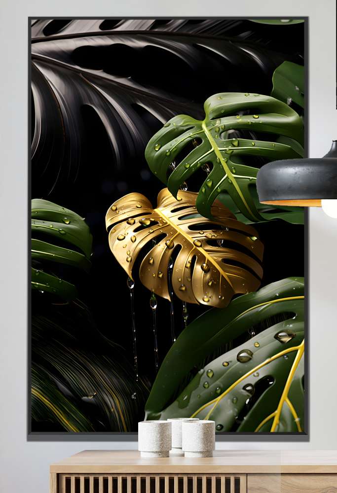 Transforme seu ambiente com elegância e sofisticação com o Quadro Decorativo Folhas de Monstera Dourada com Gotas de Água. Inspirado na exótica planta Monstera, conhecida por suas folhas grandes e recortadas, este quadro traz o luxo das folhas douradas refrescadas por gotas de água, simbolizando frescor e natureza. Ideal para trazer um toque de sofisticação tropical para sua casa ou escritório. Adicione um toque de natureza luxuosa ao seu espaço com este quadro decorativo único.