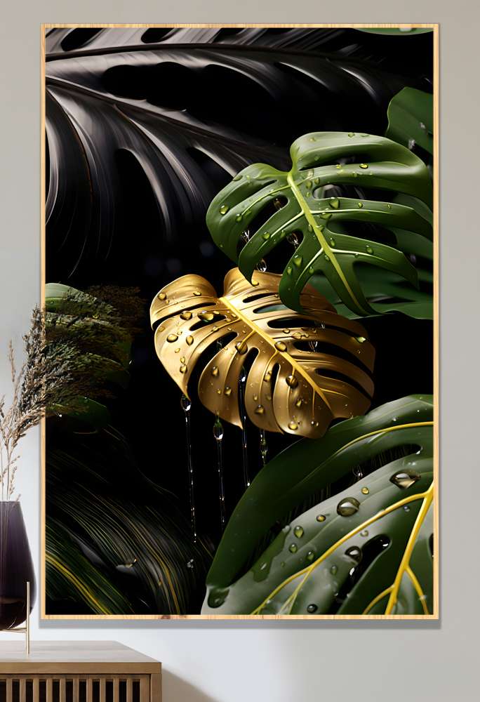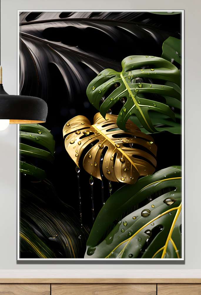 Quadro Decorativo Folhas de Monstera Dourada com Gotas de Água