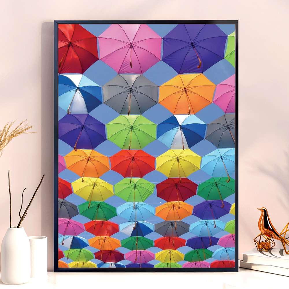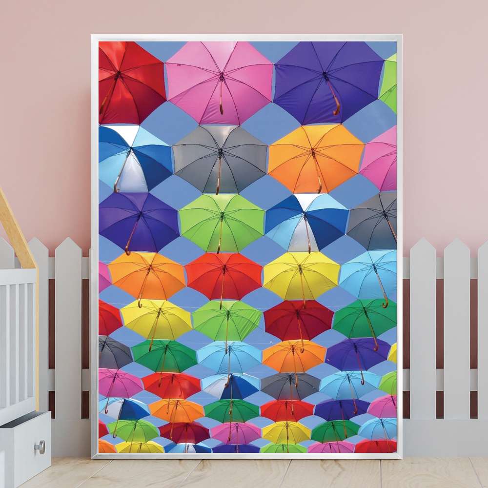 Quadro Decorativo Guardas Chuvas Coloridos Flutuando No Céu