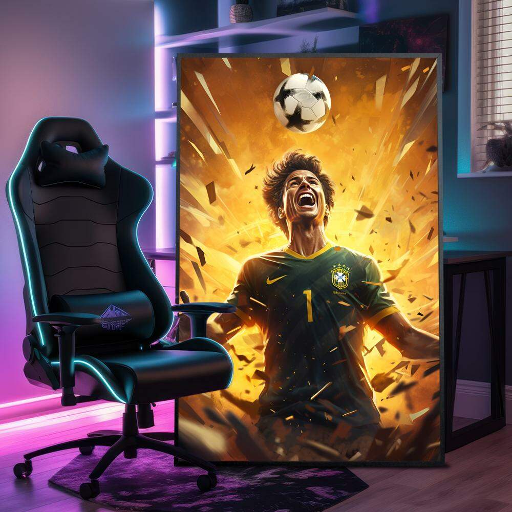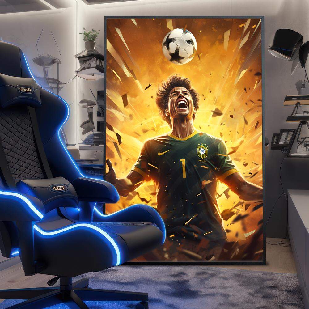 Este quadro decorativo inspirado em um game de futebol retrata um jovem jogador demonstrando garra e determinação em campo. Comemorando uma vitória com energia contagiante, a imagem captura toda a intensidade e emoção que o esporte proporciona. Perfeito para os aficionados por futebol que valorizam a perseverança e a paixão presente em cada partida. Adicione esse quadro à sua decoração e traga para o seu ambiente a vibração única do mundo do futebol.