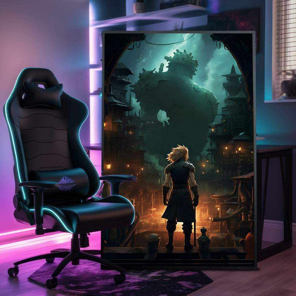 Explore o universo de Final Fantasy com este quadro decorativo que irá transformar sua casa em um cenário de fantasia épica. A arte destaca um herói imponente de costas, em meio a um cenário distópico e misterioso, com edifícios sombrios e uma figura colossal no horizonte. Perfeito para os fãs da série, esta peça captura a essência de aventura e batalha de Final Fantasy, adicionando um toque mágico à sua decoração. Garanta já o seu e mergulhe nesse universo incrível!