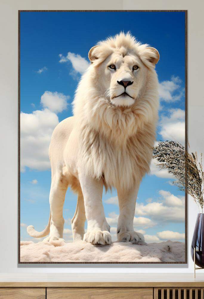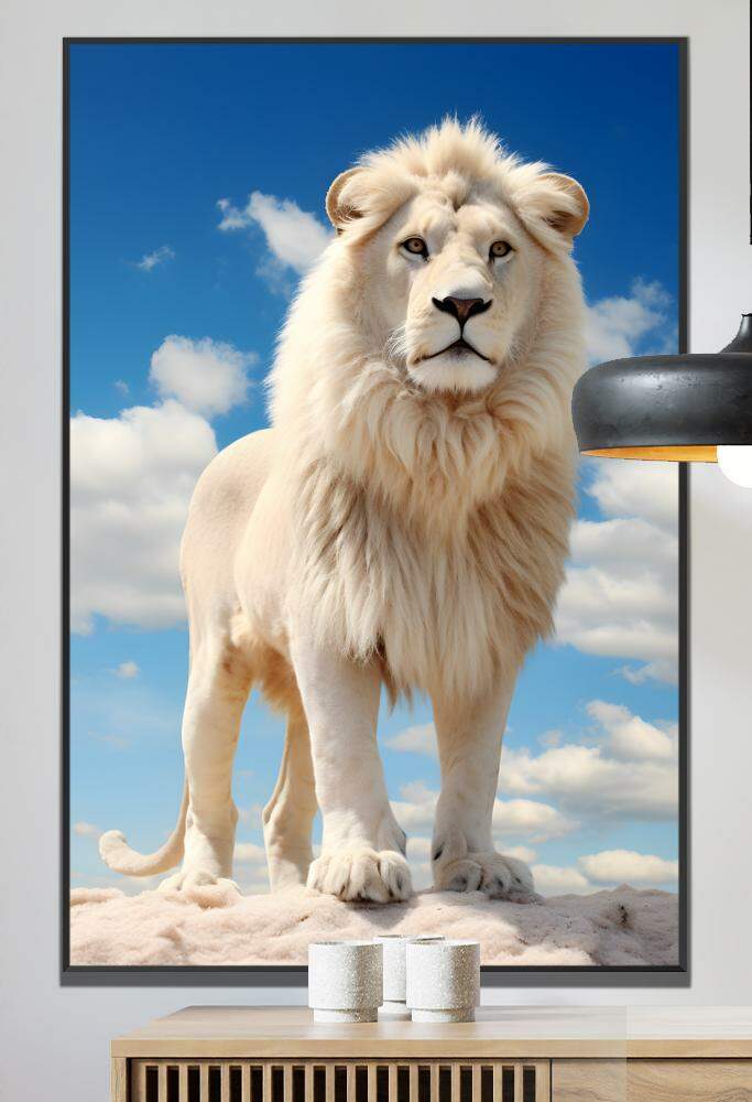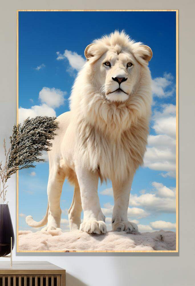Adorne sua casa com a nobreza e imponência do majestoso Leão Branco. Este quadro decorativo retrata toda a beleza e força deste símbolo de poder e realeza em um cenário deslumbrante de céu azul. Ideal para trazer sofisticação e serenidade ao seu ambiente, esta peça exclusiva irá encantar a todos os amantes da natureza selvagem e da decoração requintada. Deixe-se envolver pela aura única deste felino magnífico e transforme sua casa em um verdadeiro refúgio de elegância e estilo.