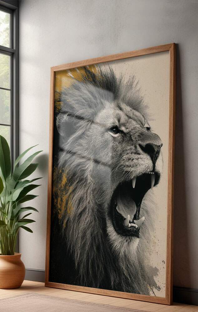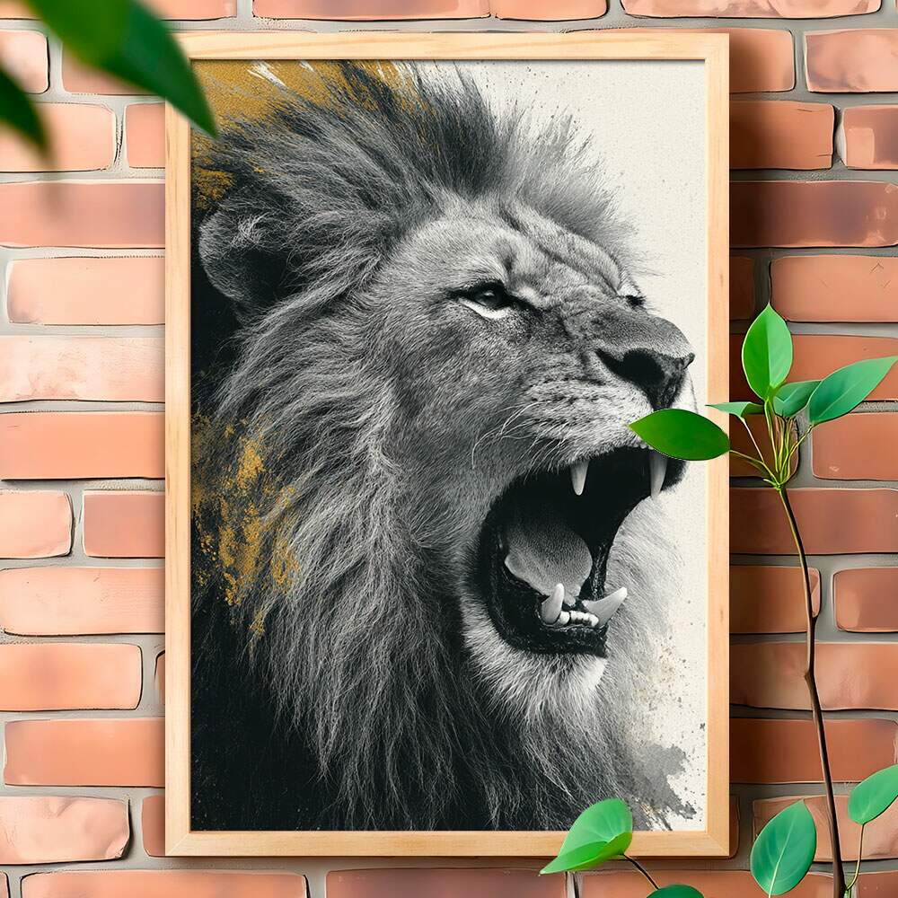 Quadro Decorativo Leão Furioso Preto e Branco Com Dourado
