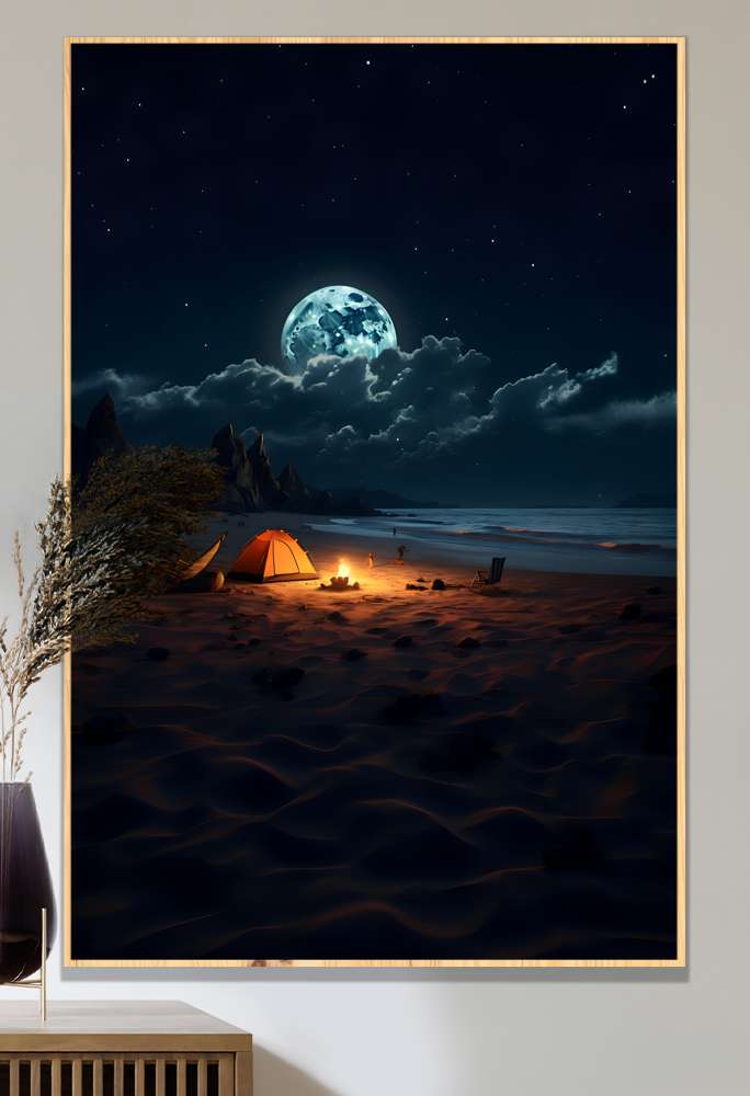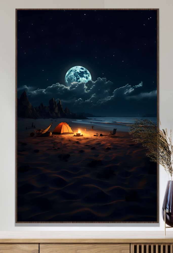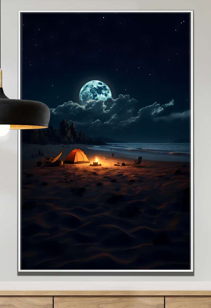 Um cenário deslumbrante é capturado neste quadro decorativo, onde a lua cheia ilumina uma praia tranquila com uma fogueira crepitante e uma barraca acolhedora. Deixe-se envolver pela atmosfera de serenidade, aventura e conexão com a natureza que esta imagem transmite. Ideal para decorar seu espaço e trazer uma sensação de calma e tranquilidade para o ambiente. Adquira já este quadro e transforme sua casa em um refúgio de paz à beira-mar.
