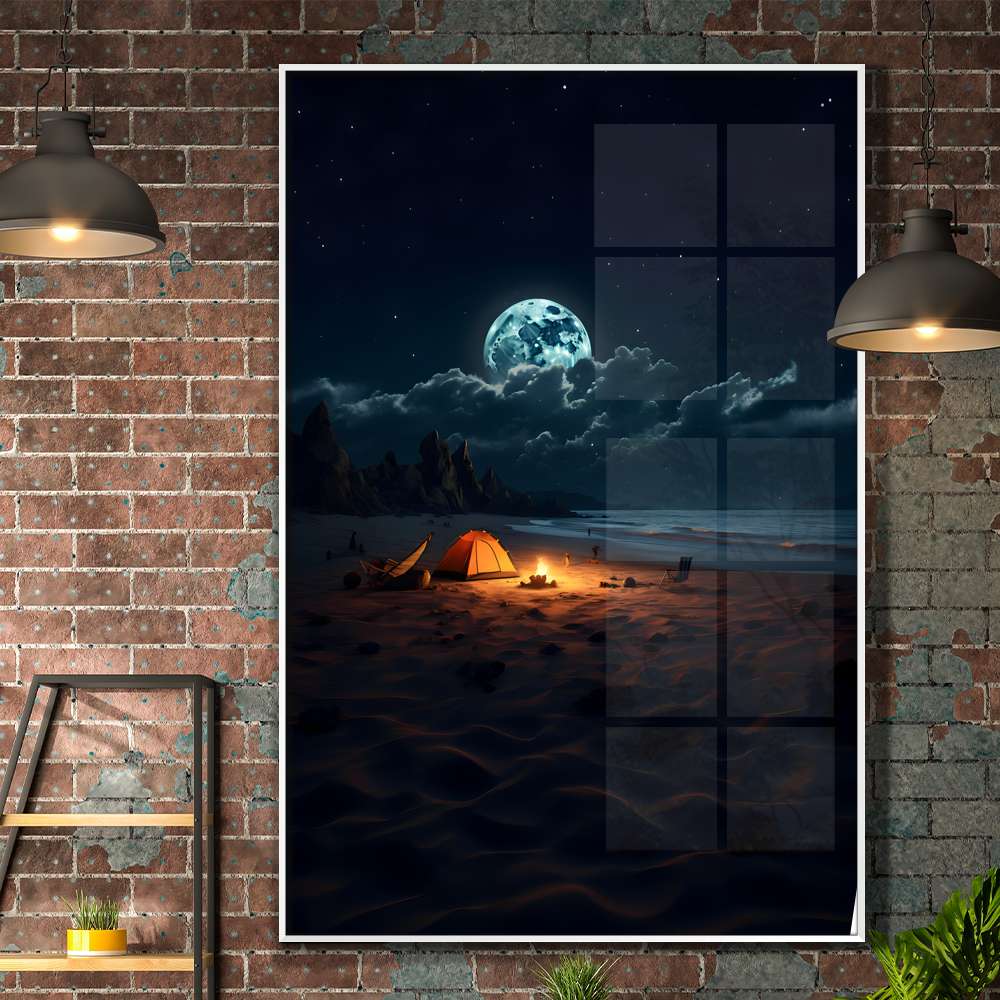 Quadro Decorativo Lua Cheia e Praia com Fogueira e Barraca