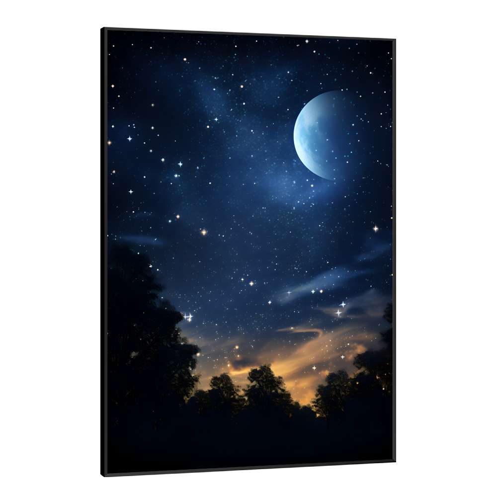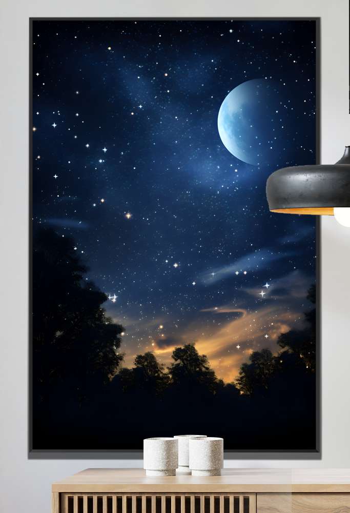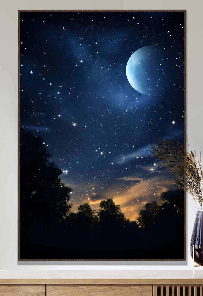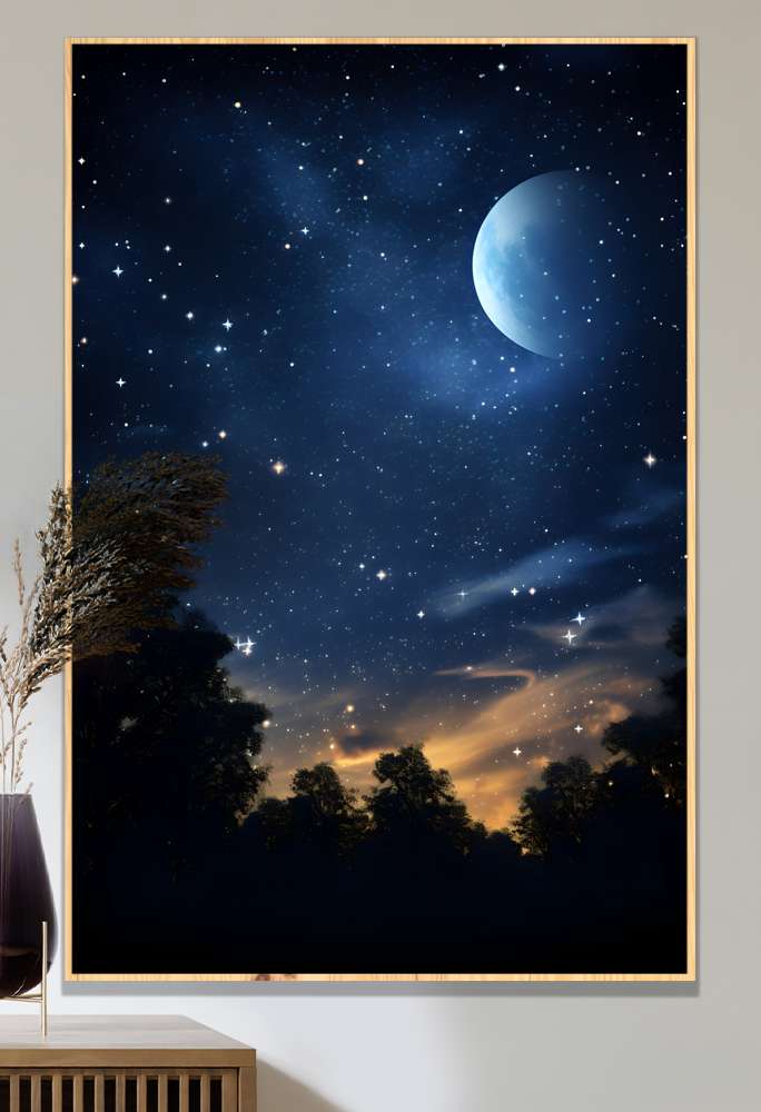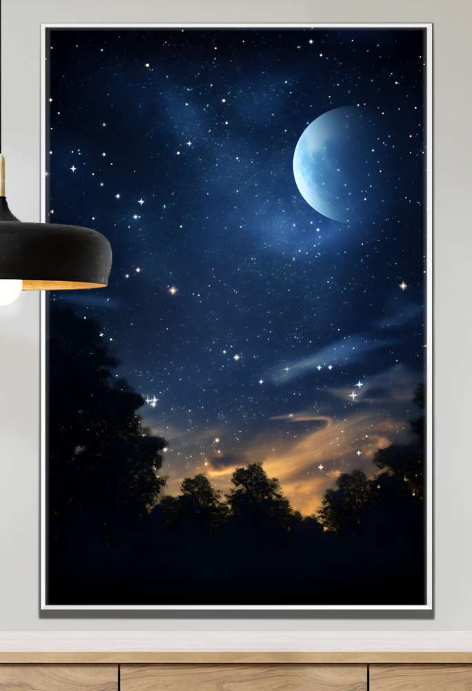 Encante-se com o Quadro Decorativo Lua com Céu Estrelado e Florestas! A imagem da lua brilhante em um céu estrelado, com suas florestas ao fundo, cria uma atmosfera mágica e serena. As estrelas cintilantes e a silhueta das árvores ao entardecer evocam paz e beleza natural, transportando você para a tranquilidade da noite. Transforme seu espaço em um refúgio de paz e harmonia com este quadro encantador.