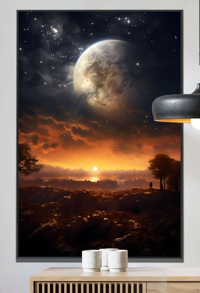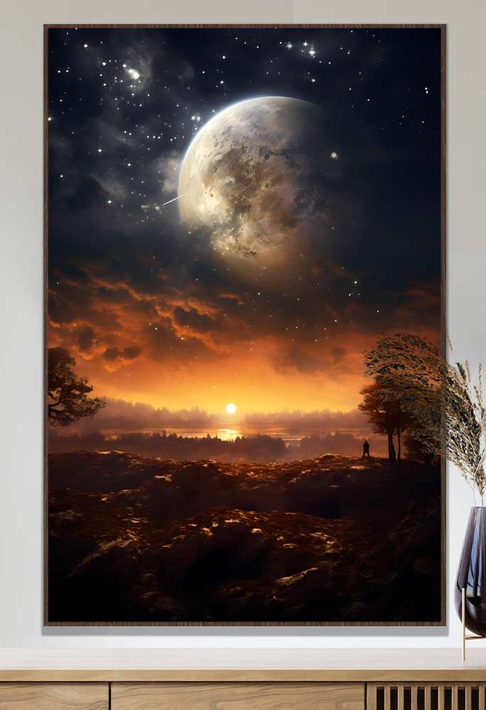 Explore a magia do céu estrelado e da savana em sua casa com o Quadro Decorativo Lua e Sol Iluminando Savana. Deixe-se envolver pela vastidão do horizonte, onde a lua cheia brilha com serenidade e o pôr do sol pinta o céu com tons vibrantes de laranja e dourado. Esta peça irradia tranquilidade e beleza natural, trazendo uma atmosfera única e encantadora para o seu ambiente. Garanta já essa incrível combinação de elementos da natureza em uma obra de arte única.