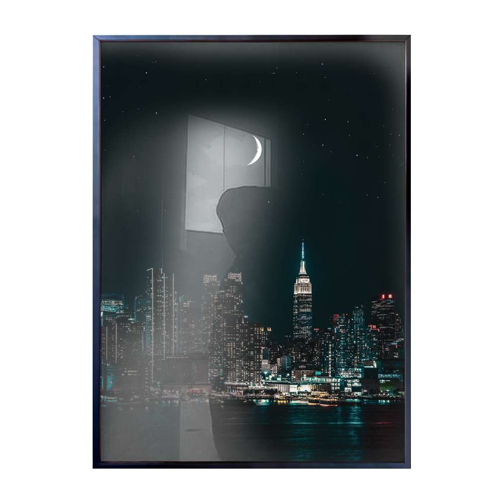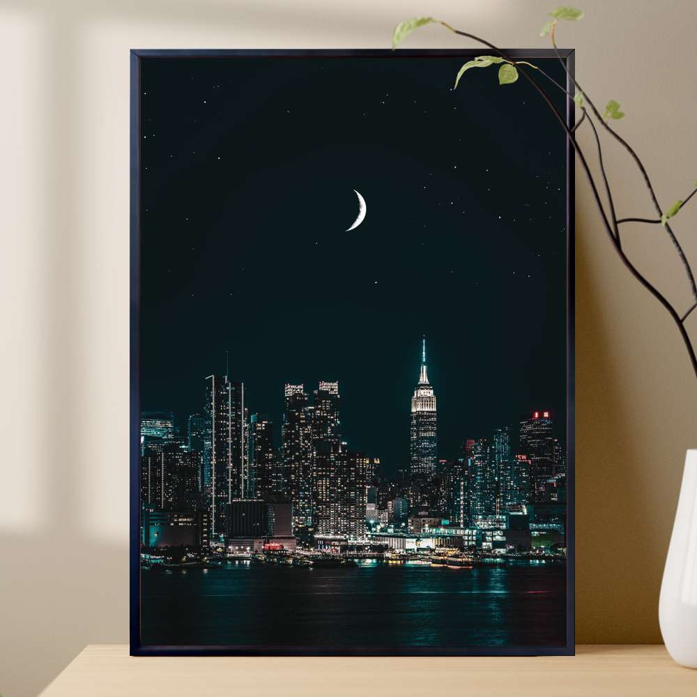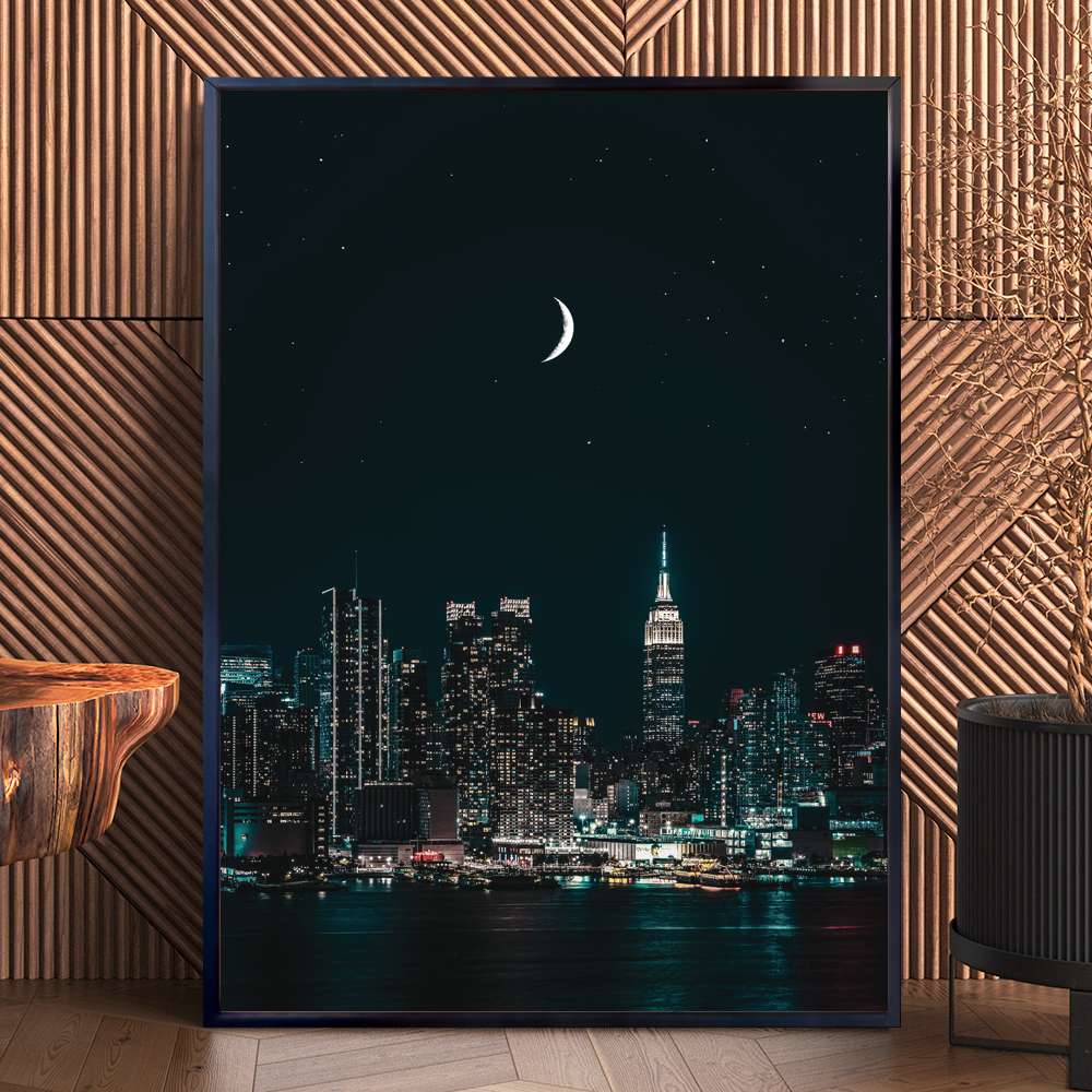 O Quadro Decorativo Lua Na Cidade Grande A Noite retrata a vibrante cidade de Nova York em um cenário noturno, com as luzes da cidade, criando uma atmosfera mágica e encantadora. A lua crescente brilha sobre uma metrópole iluminada, destacando a grandiosidade dos arranha-céus contra o céu noturno estrelado. Essa combinação de luz natural e urbana capturada na imagem simboliza a beleza e a serenidade que podem ser encontradas no meio do agito da cidade grande. Ideal para quem deseja adicionar um toque cosmopolita e poético à decoração. Transforme seu ambiente em um verdadeiro refúgio urbano com essa peça única.