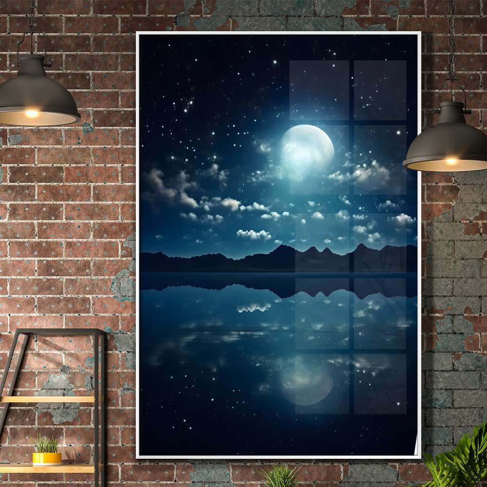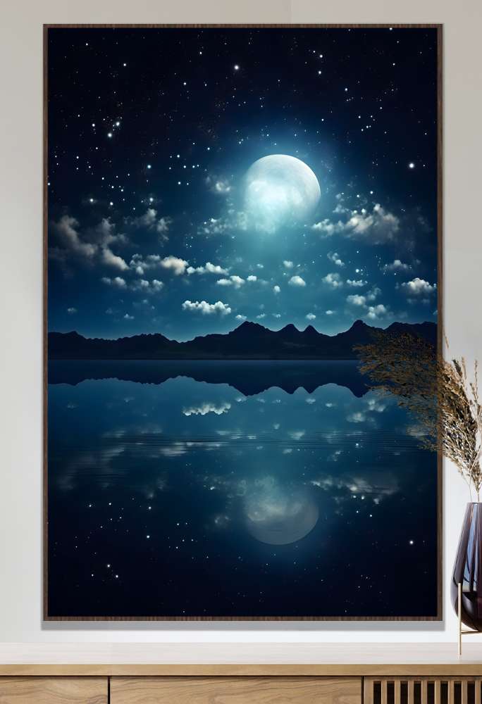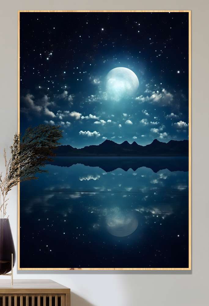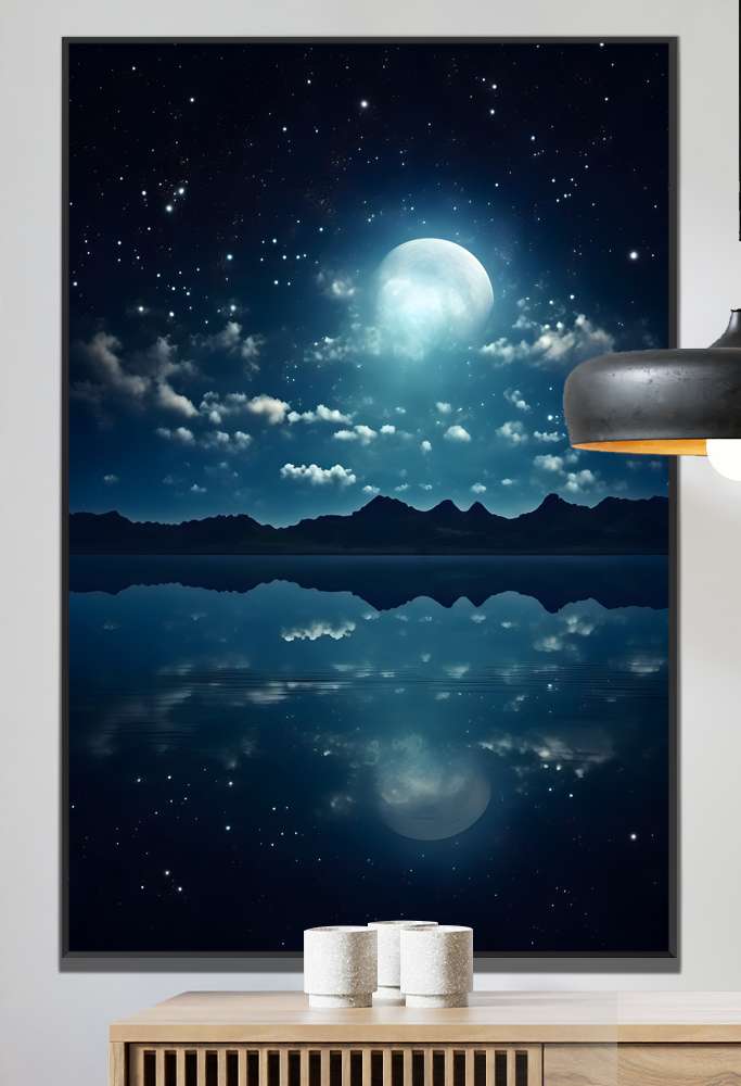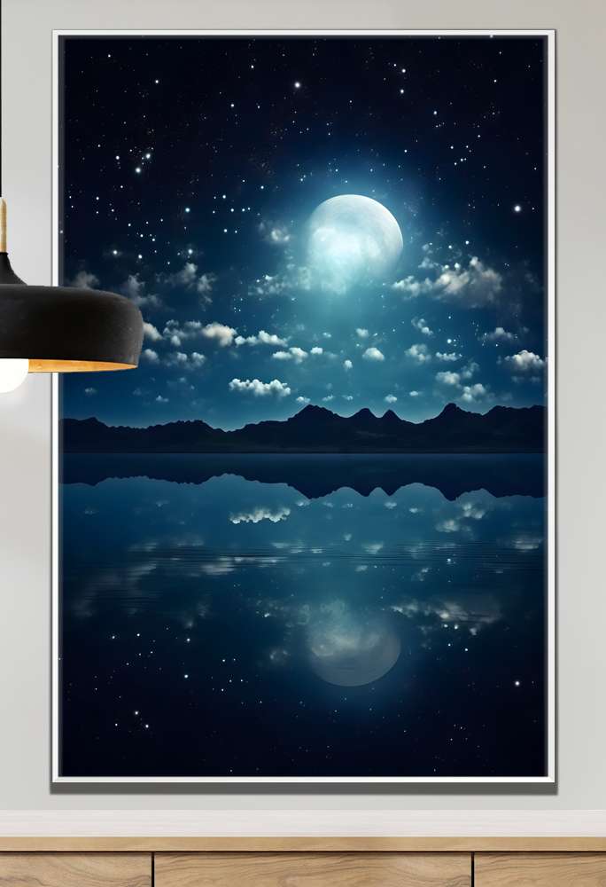 Transforme a decoração da sua casa com o Quadro Decorativo Luar Refletindo em Rio. A imagem retrata uma cena encantadora: uma lua cheia brilhando sobre um rio sereno, com seu reflexo criando uma vista hipnotizante e tranquila. As montanhas escuras em silhueta ao fundo complementam o cenário noturno, enquanto estrelas salpicam o céu, tornando o ambiente ainda mais mágico e contemplativo. Deixe-se envolver por essa atmosfera de paz e beleza em cada olhar para este quadro. Perfeito para trazer uma sensação de calma e relaxamento para qualquer espaço da sua casa. Transforme seu ambiente em um refúgio de tranquilidade com o Quadro Decorativo Luar Refletindo em Rio.